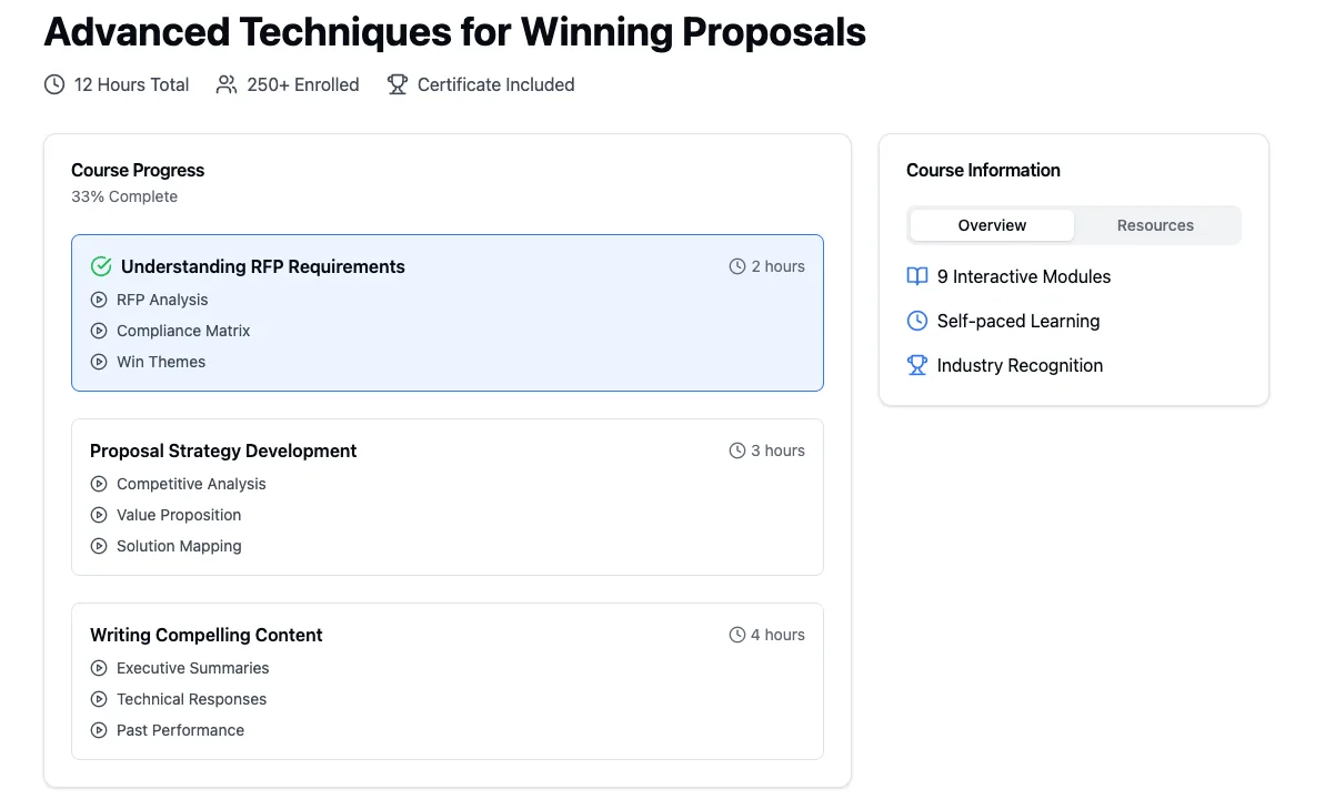This course is designed for professionals who want to elevate their proposal writing skills to an expert level. Participants will learn advanced techniques to craft proposals that captivate decision-makers and address complex client requirements. The course focuses on creating engaging narratives by incorporating storytelling techniques to connect emotionally with clients, making proposals more memorable and persuasive.