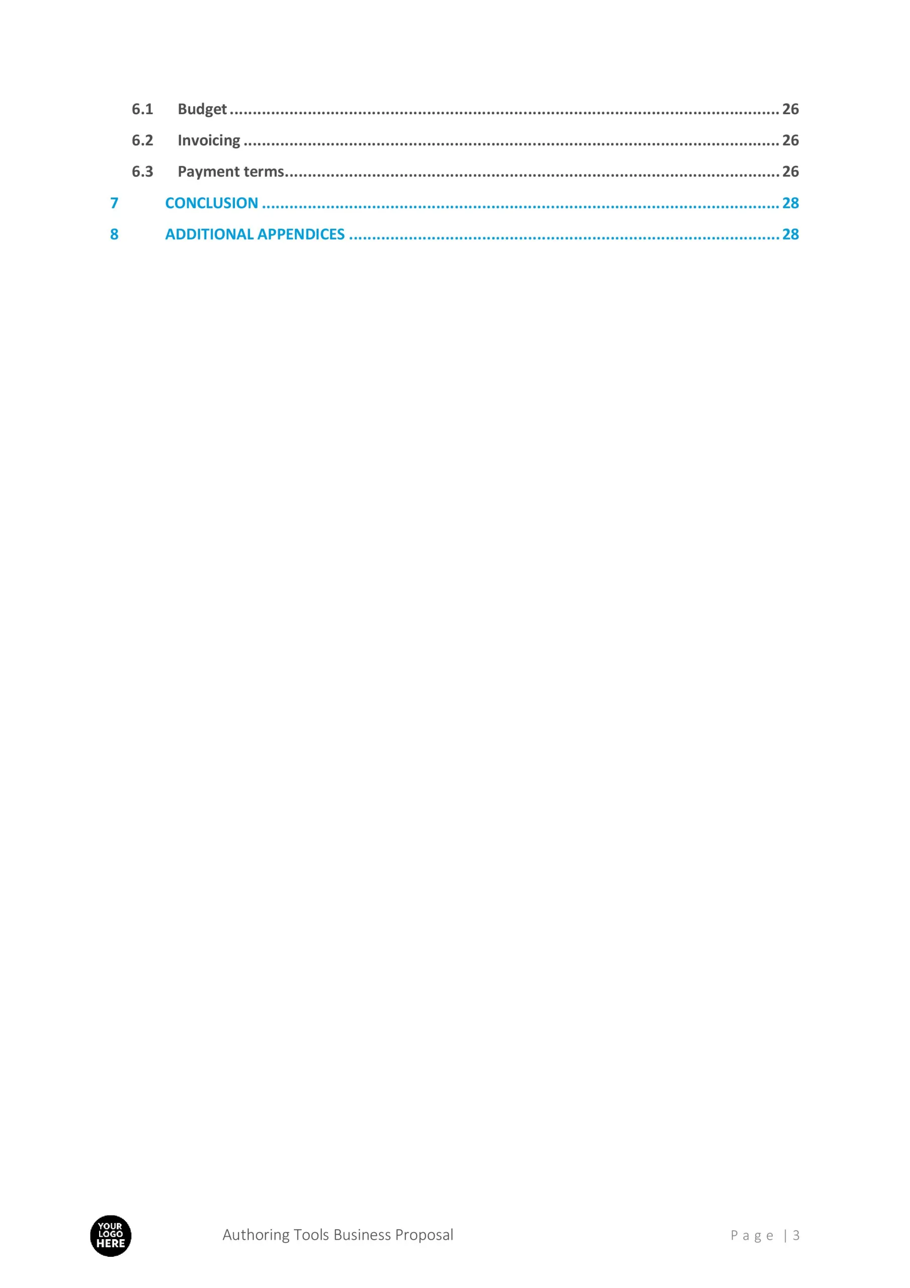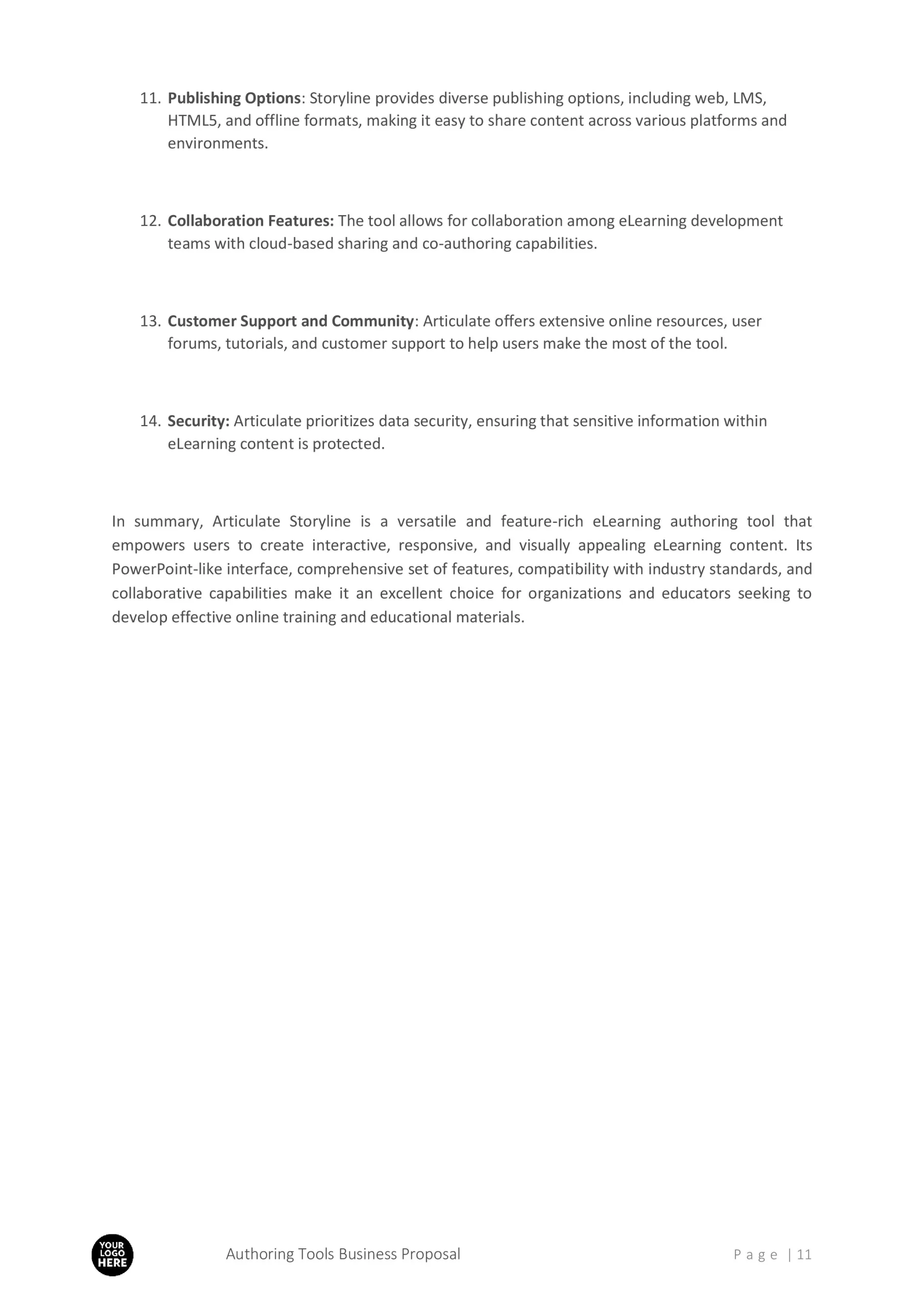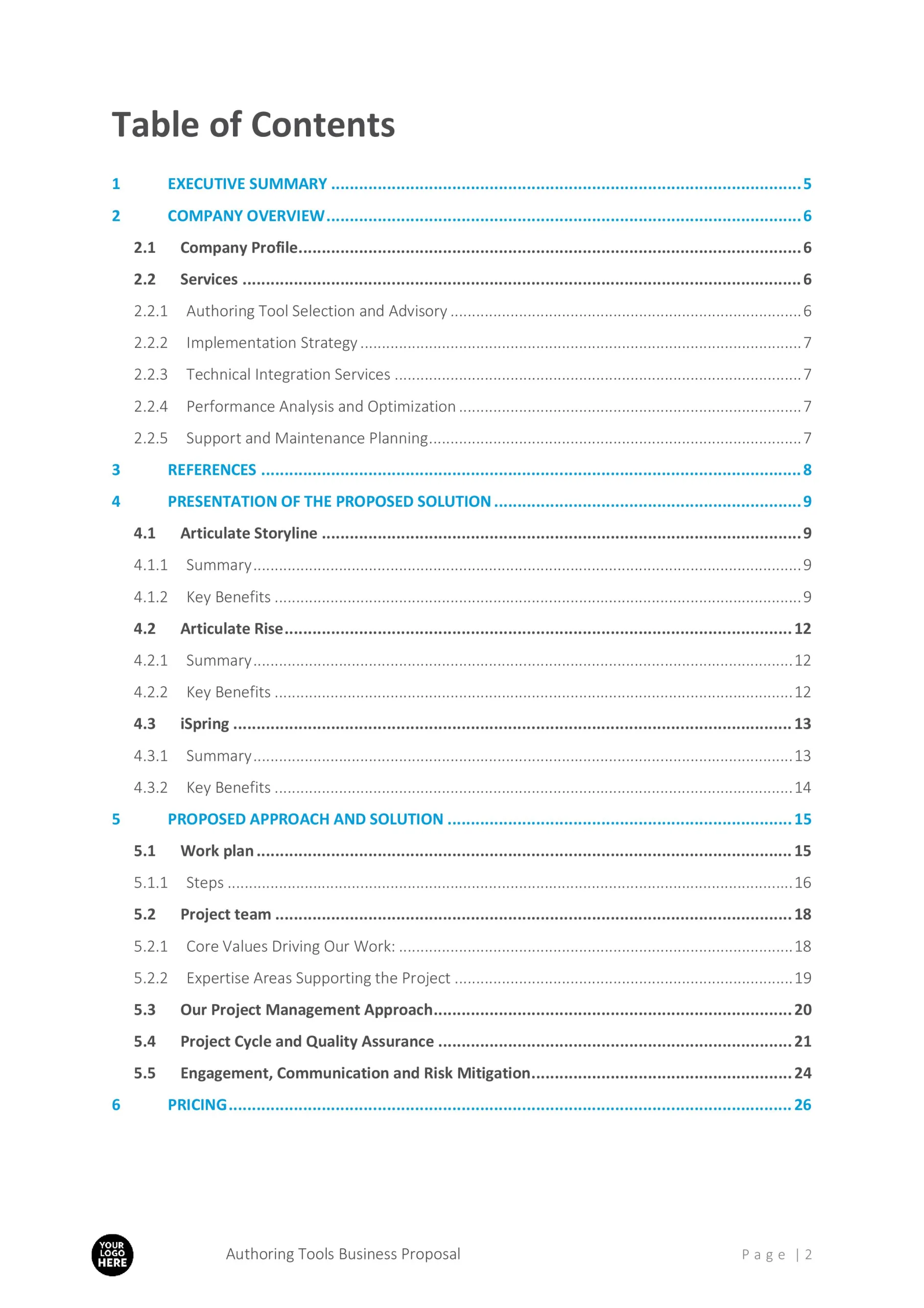 This template is the ideal starting point for creating professional, comprehensive proposals for authoring tools and consulting services, saving you valuable time while ensuring no critical aspects are overlooked in your client presentations.