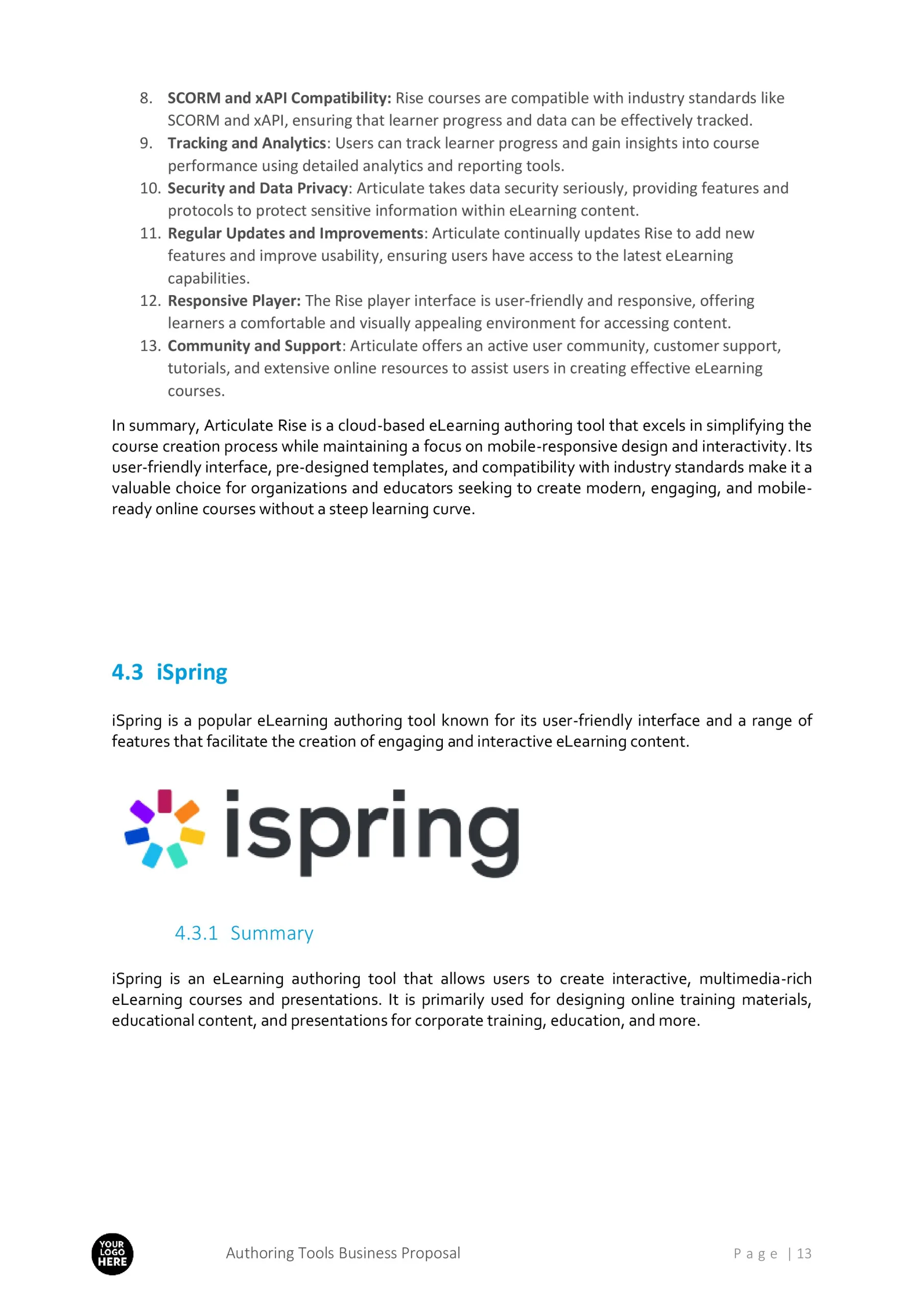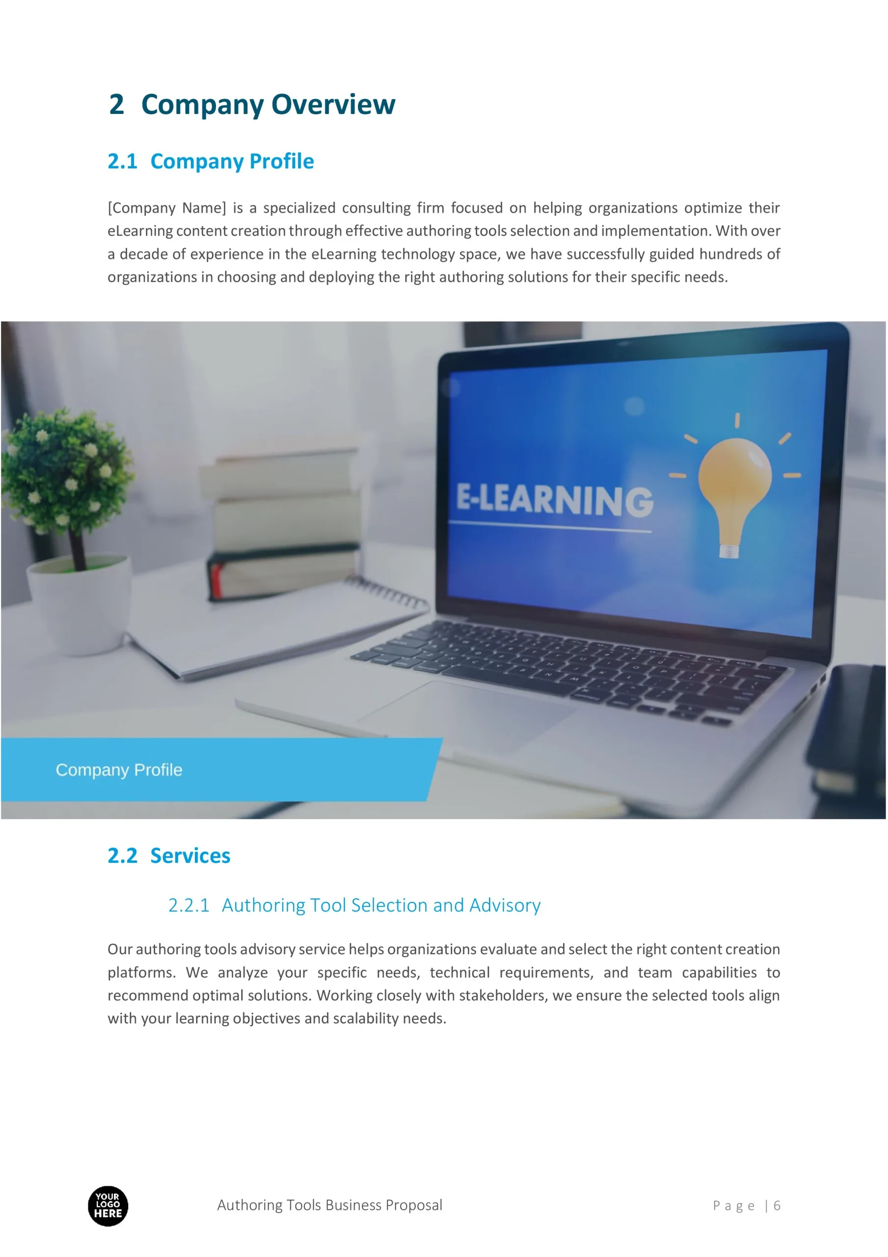 The Authoring Tools Consulting Business Proposal Template is a professionally crafted, fully customizable document designed specifically for consultants and firms specializing in eLearning authoring tools consulting services. This extensive template provides a complete framework for presenting your expertise in selecting, implementing, and optimizing authoring tools like Articulate Storyline, Rise, and iSpring.