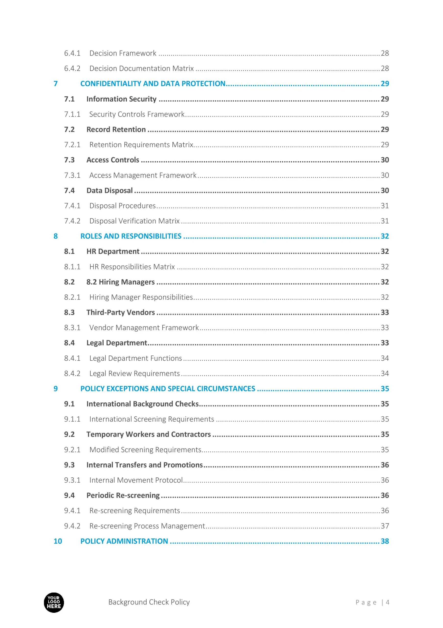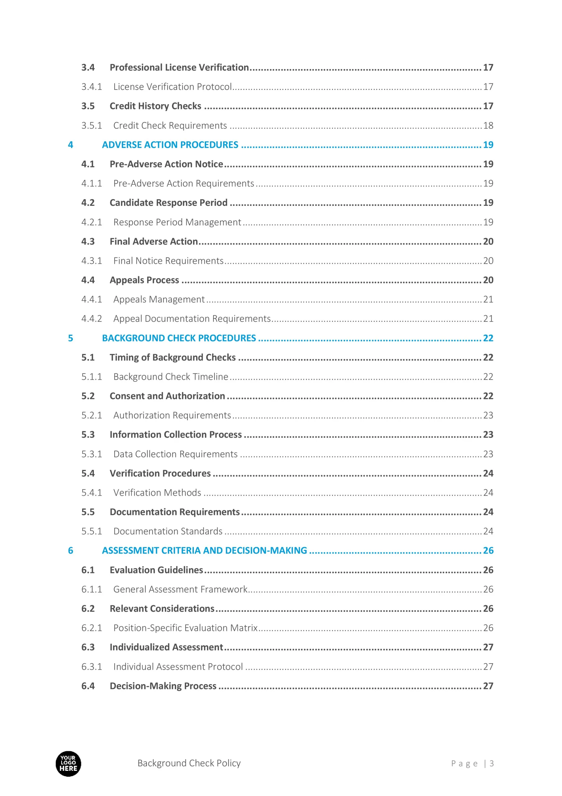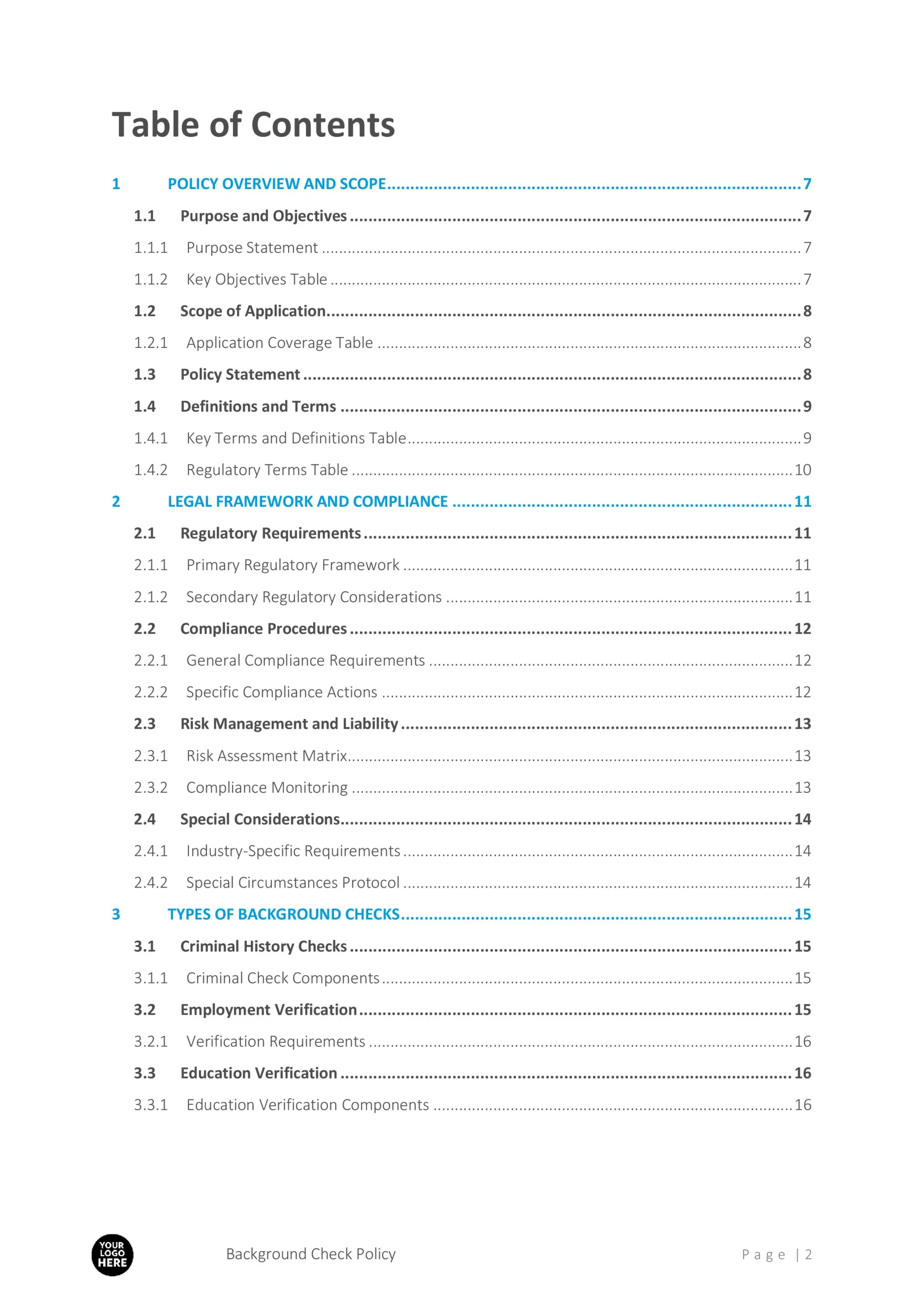 Developed by industry experts, this template covers all essential aspects of a robust background check policy, ensuring compliance with relevant laws and regulations. It provides detailed sections on the scope of background checks, the types of information to be verified, the criteria for evaluation, and the procedures for maintaining confidentiality and data privacy.