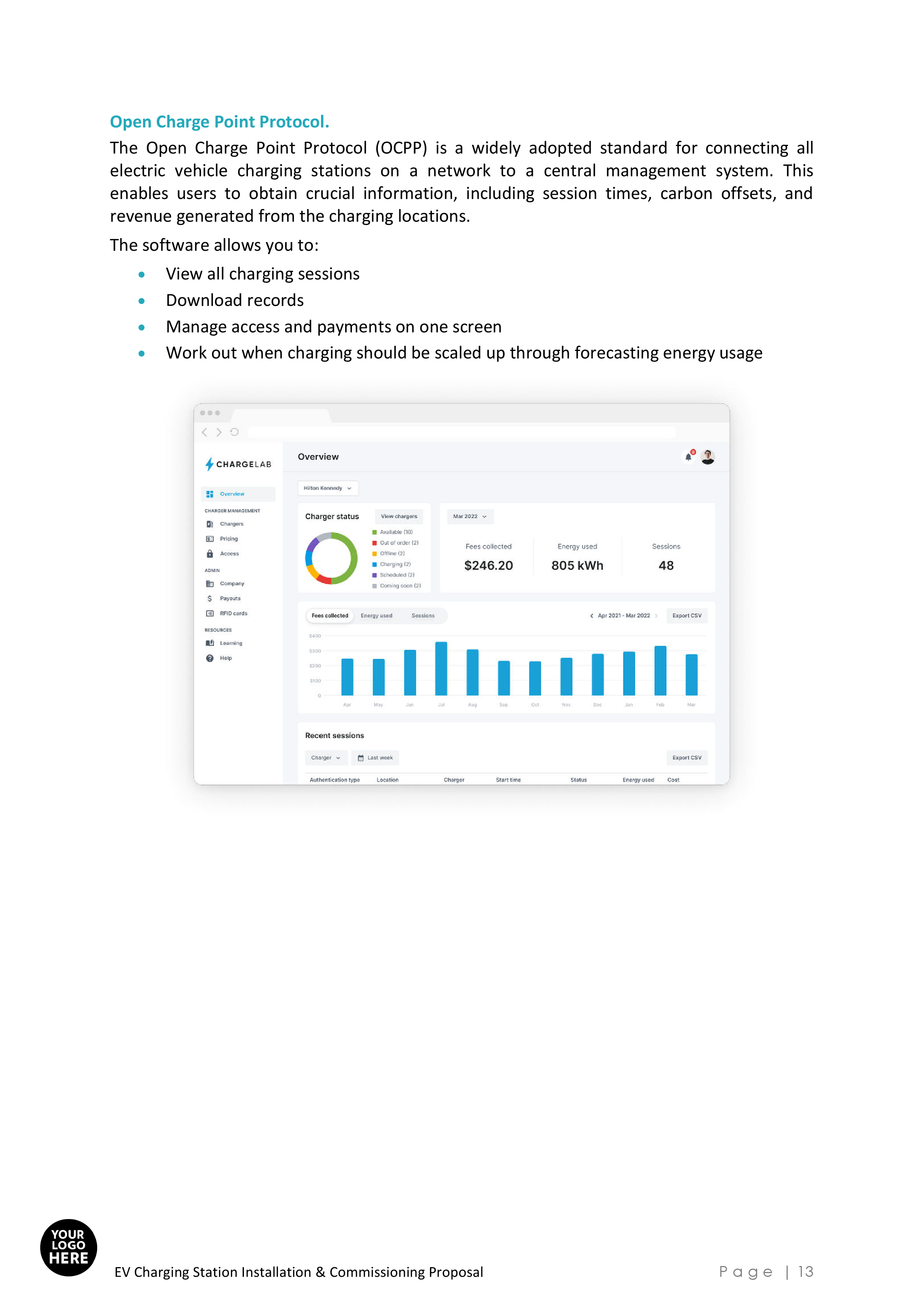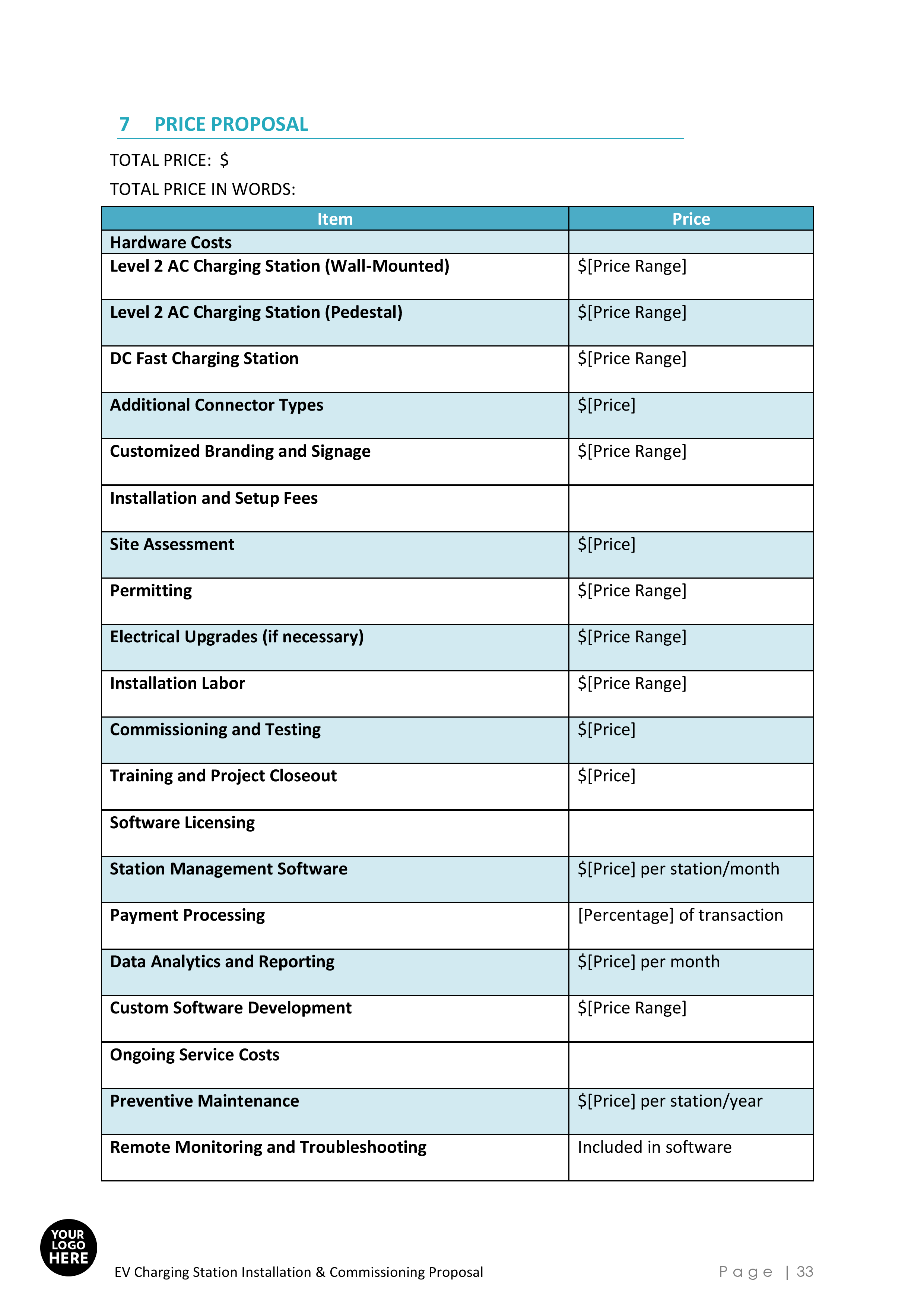 A customizable template for proposing EV charging station installation and commissioning services to potential clients.