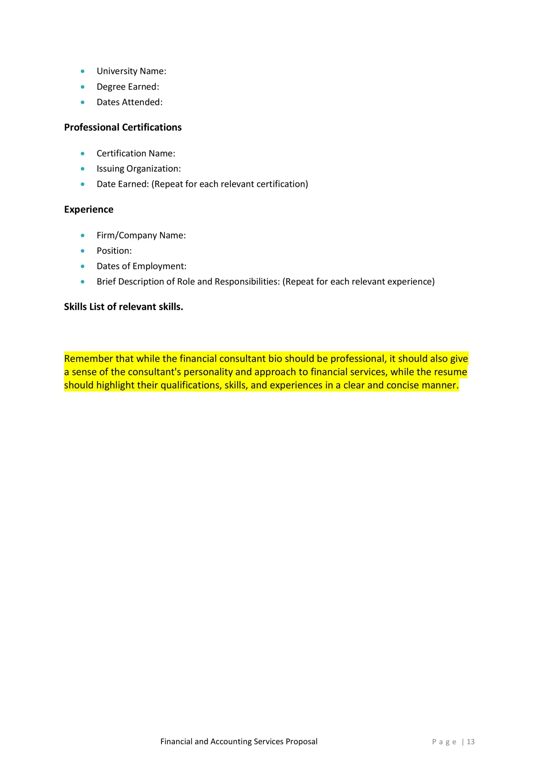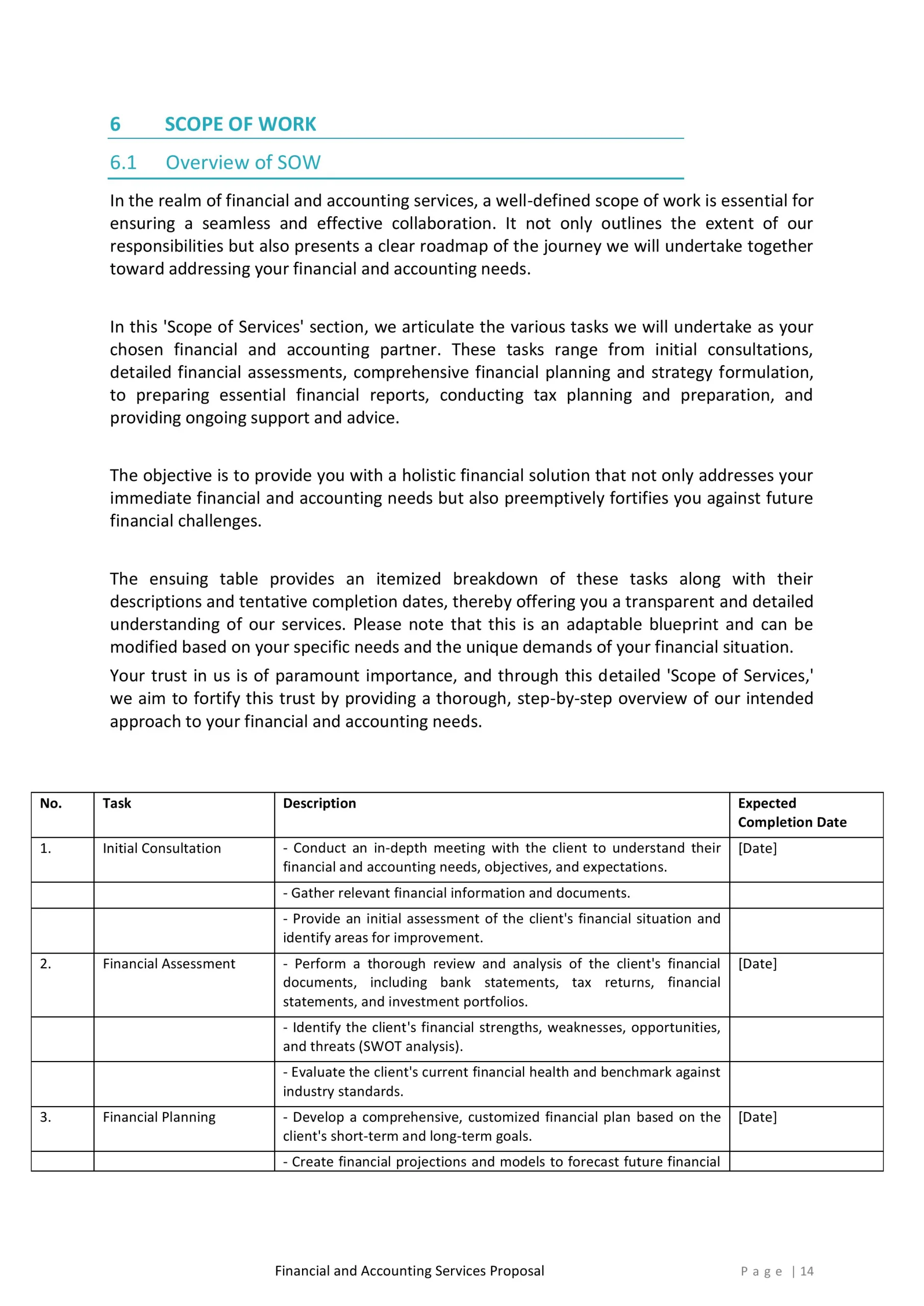Designed with efficiency and convenience in mind, this downloadable document is the ultimate tool for financial and accounting service providers. Whether you are a small firm or a large corporation, our template will help you create a compelling and persuasive proposal that will impress your clients and win their trust.