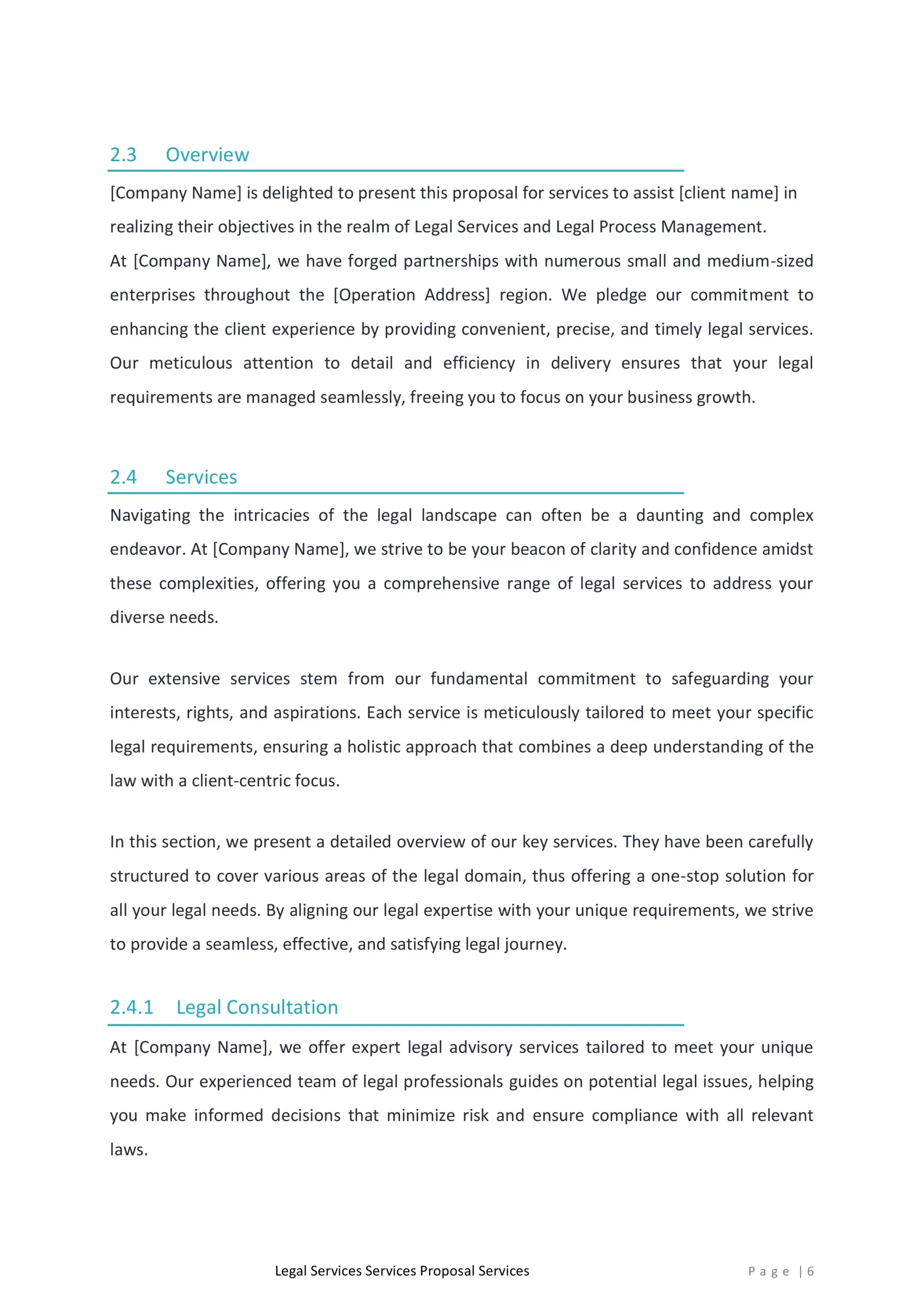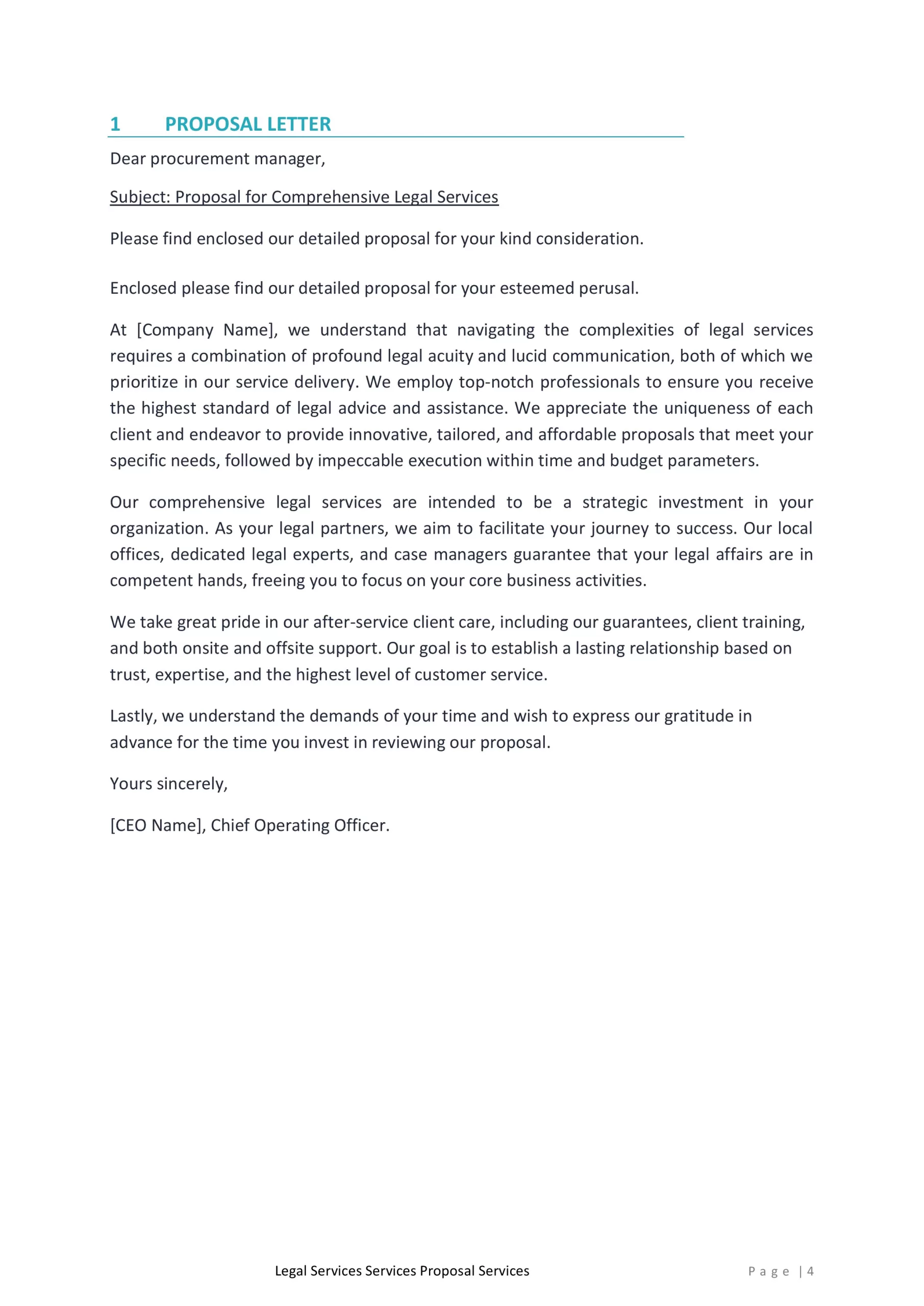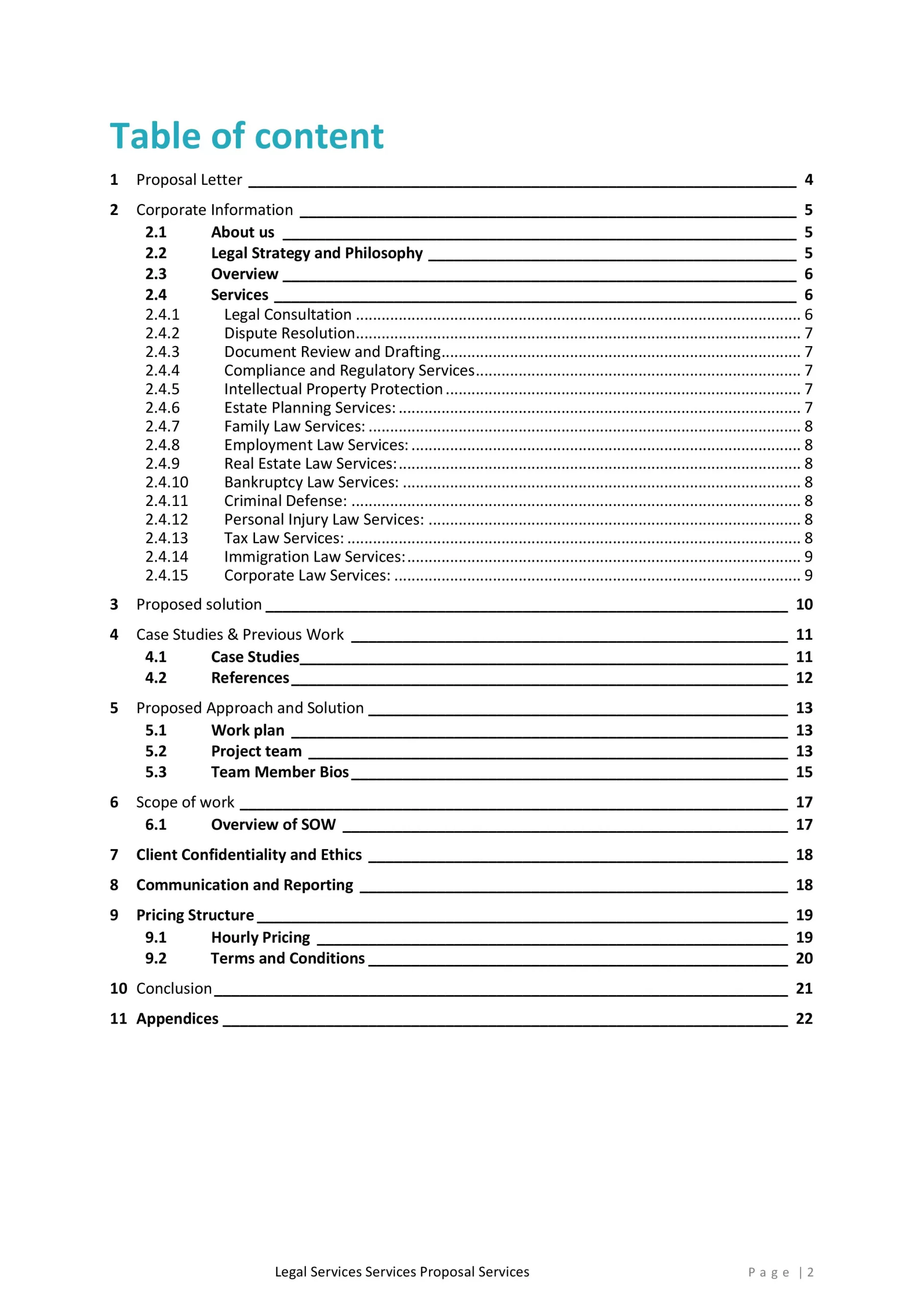 This example proposal for legal services will help law firms, lawyers, and attorneys prepare proposals and quotes for clients. This legal proposal template includes sections for the cover letter, bios of your legal team, an overview of your services, and a fee table of your rates, both by the hour and on retainer.