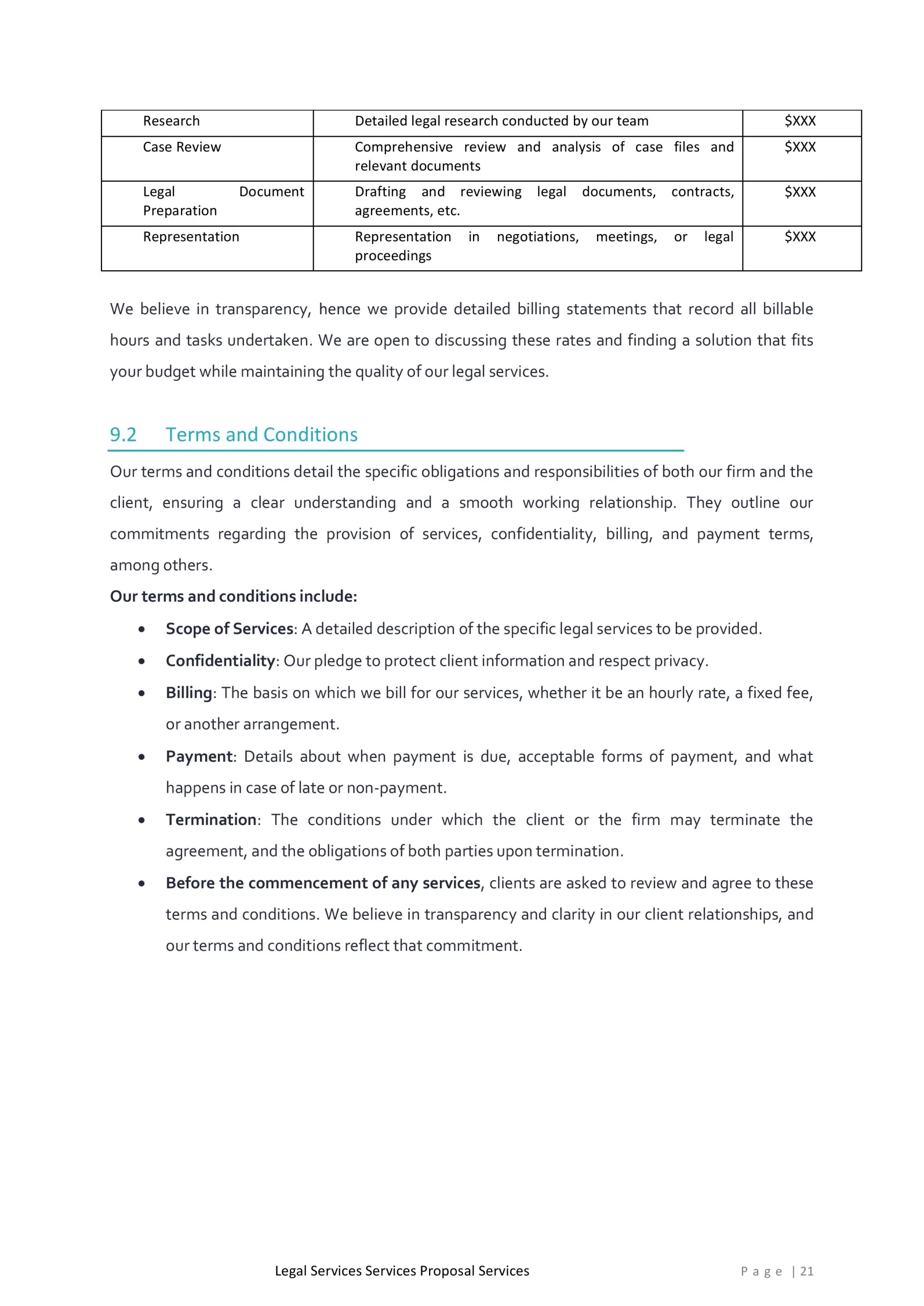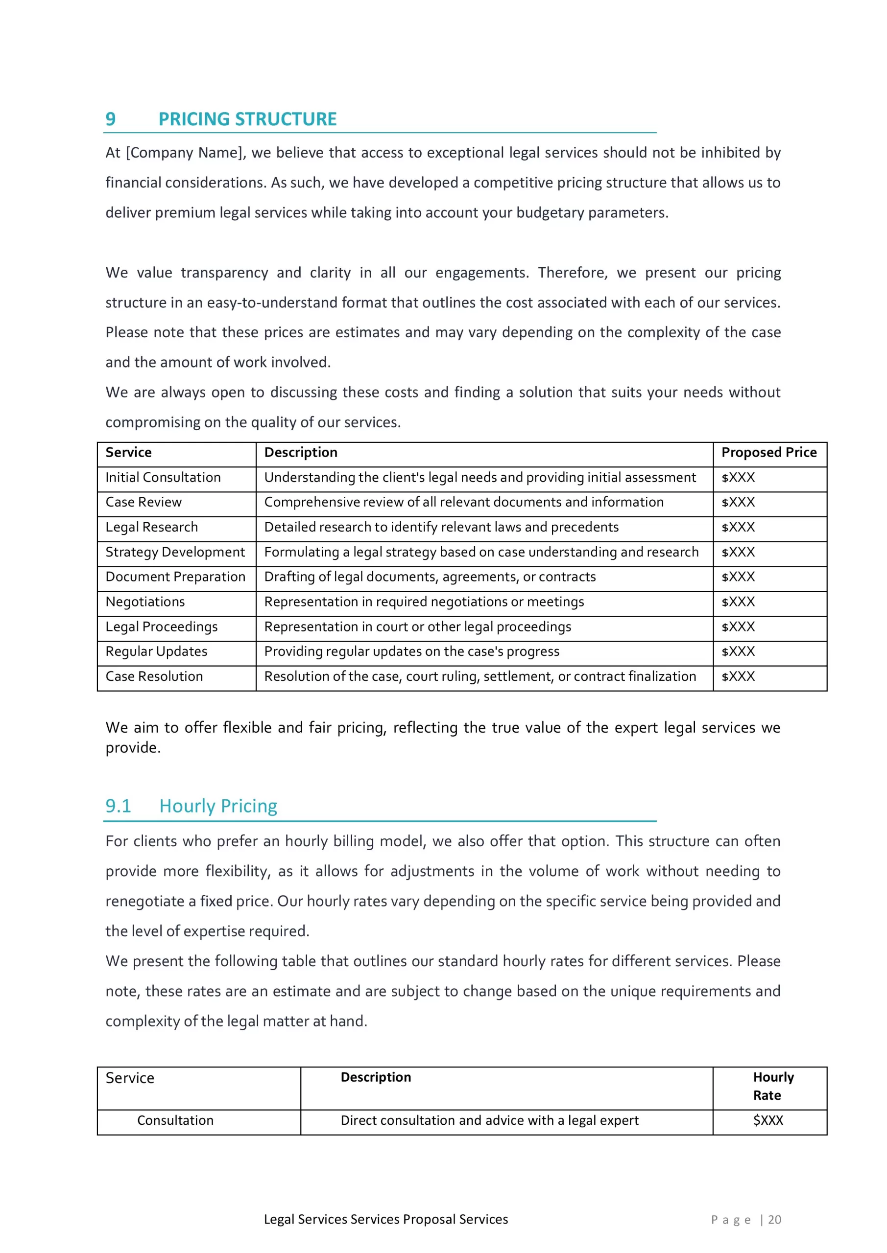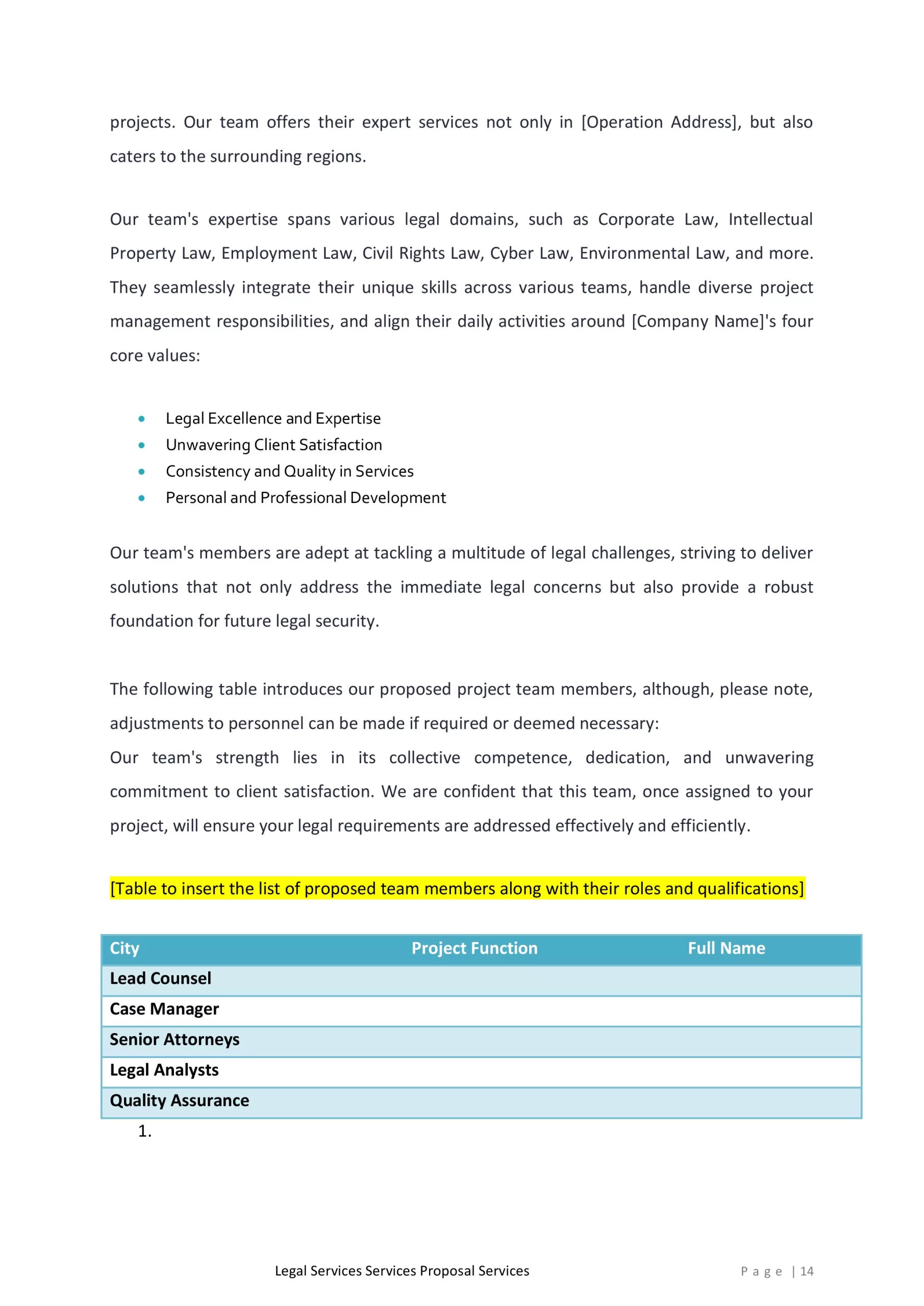 This example proposal for legal services will help law firms, lawyers, and attorneys prepare proposals and quotes for clients. This legal proposal template includes sections for the cover letter, bios of your legal team, an overview of your services, and a fee table of your rates, both by the hour and on retainer.