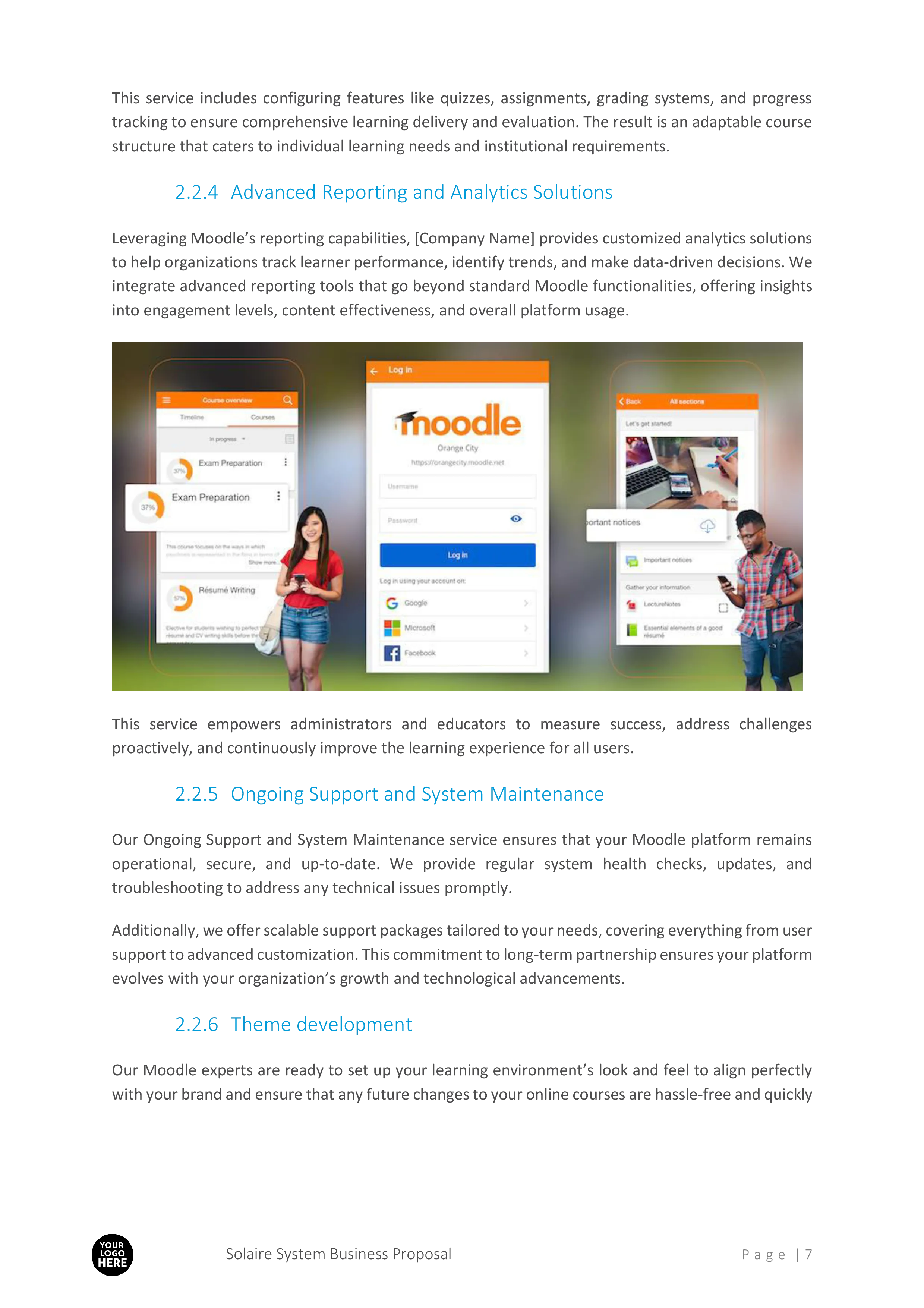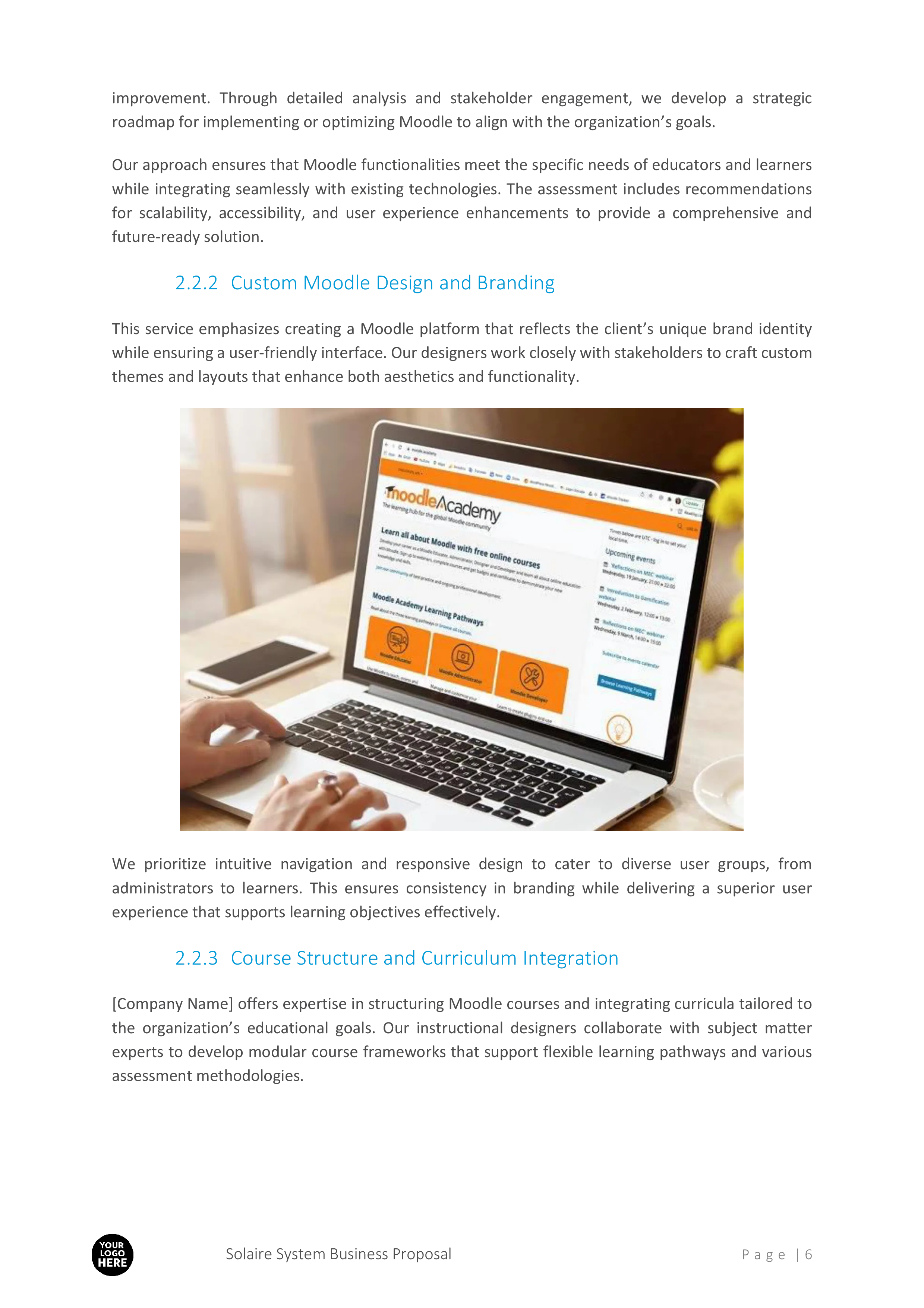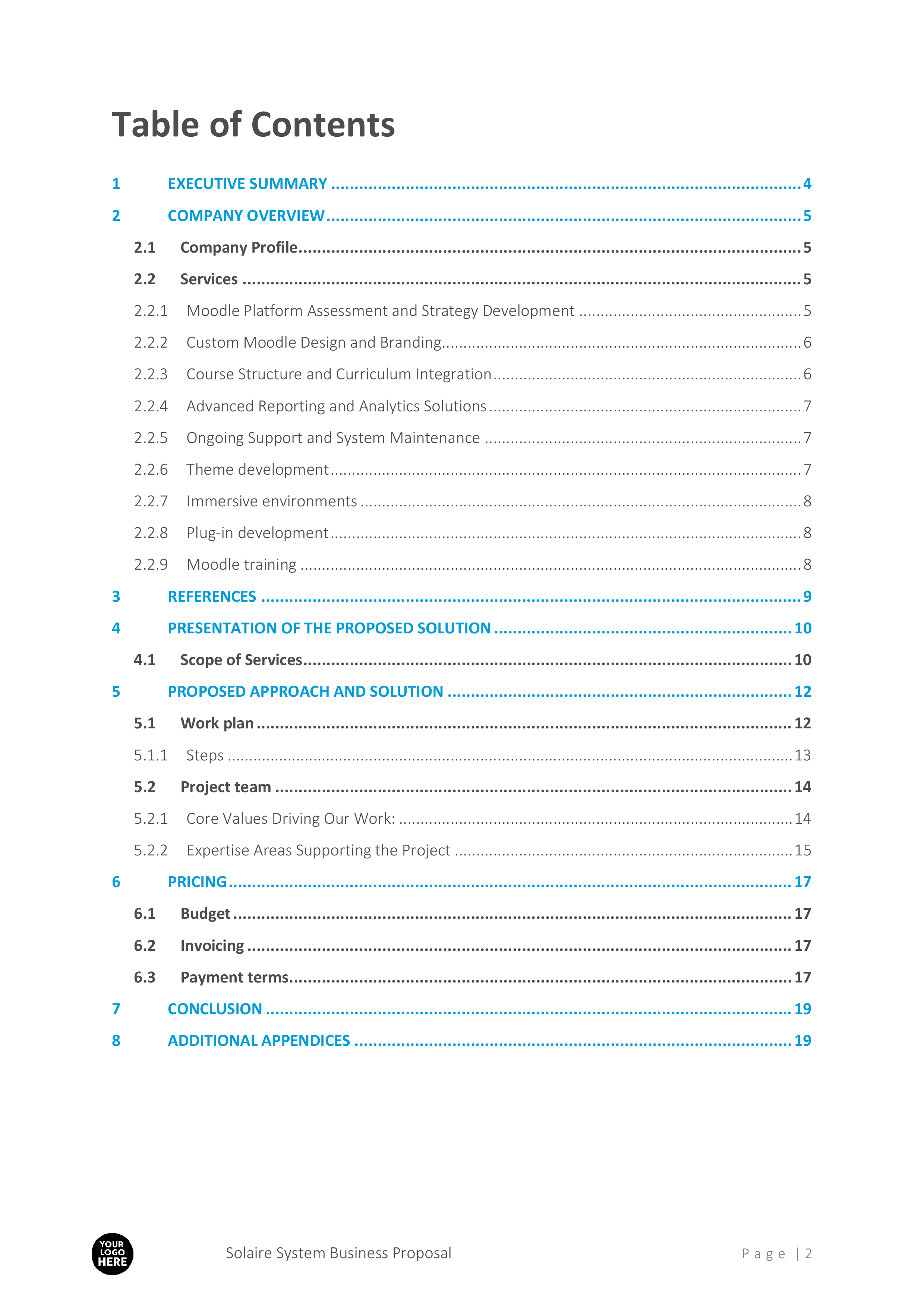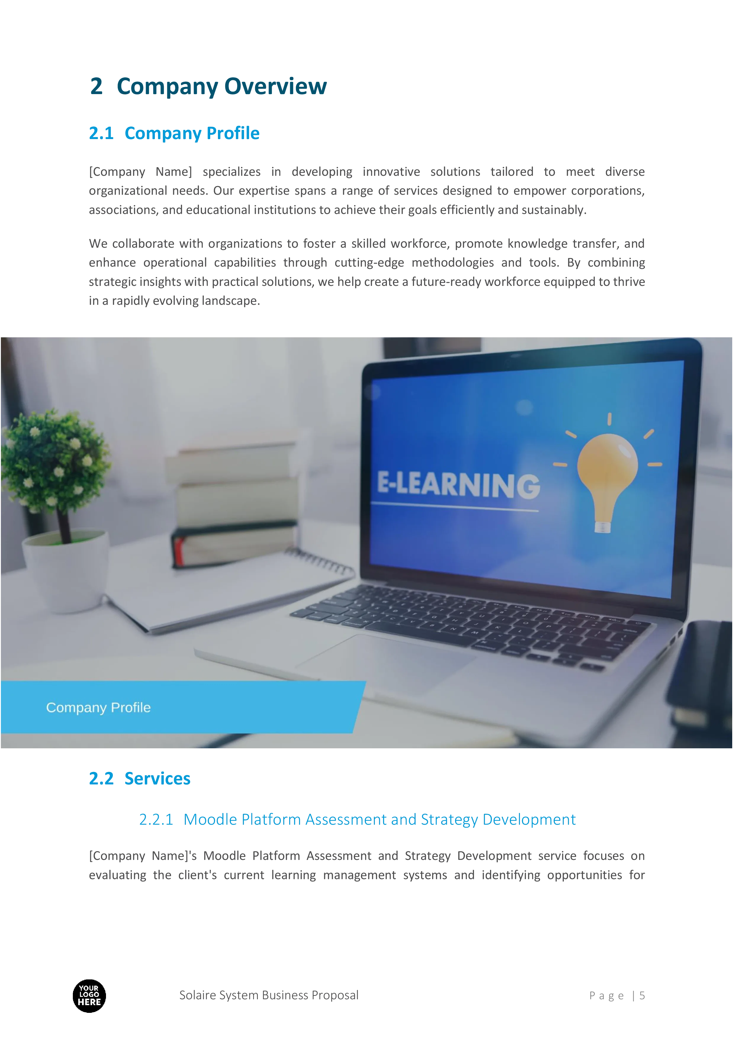 - Company Overview: Showcase your organization’s expertise, core values, and mission in delivering innovative Moodle solutions.