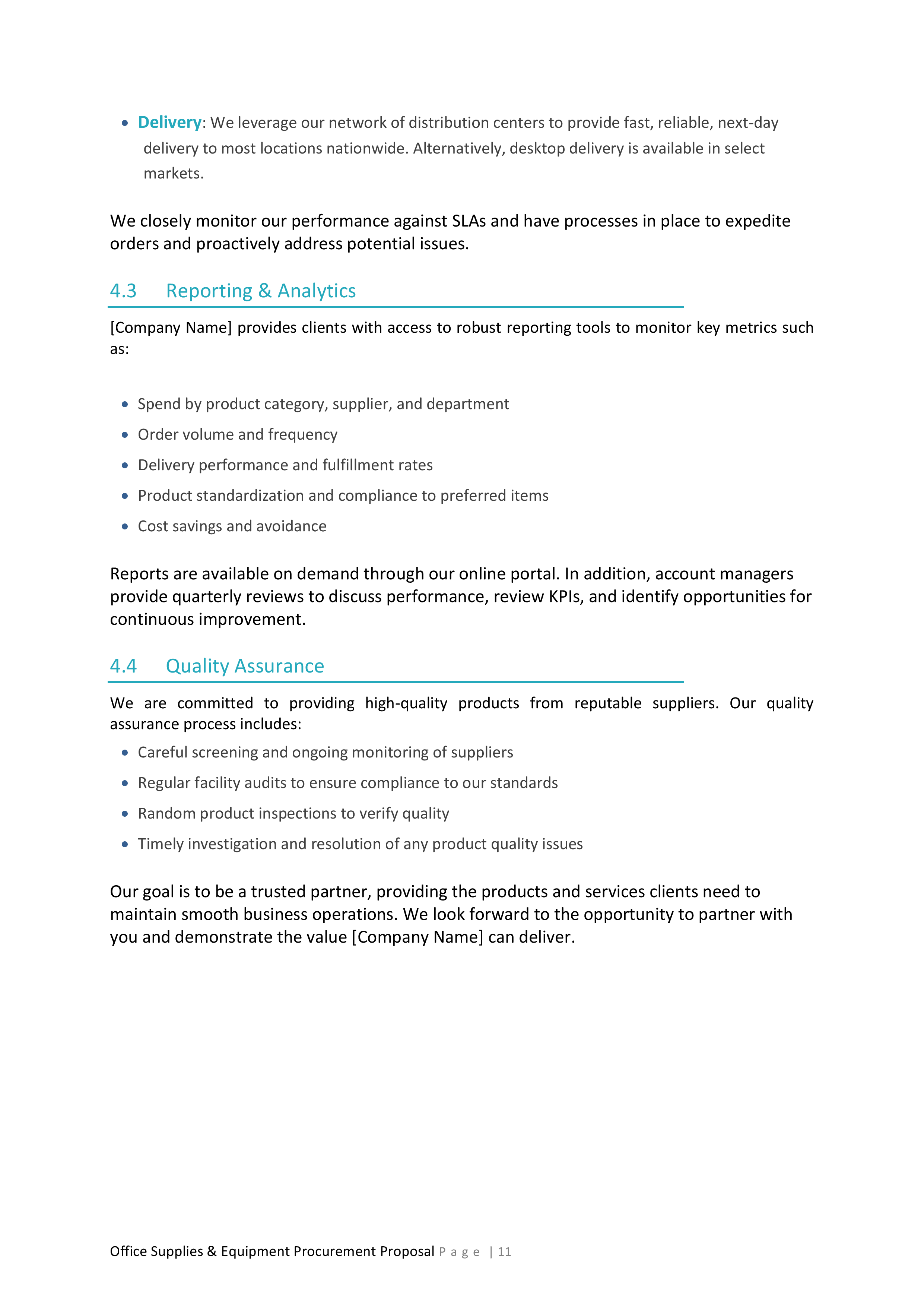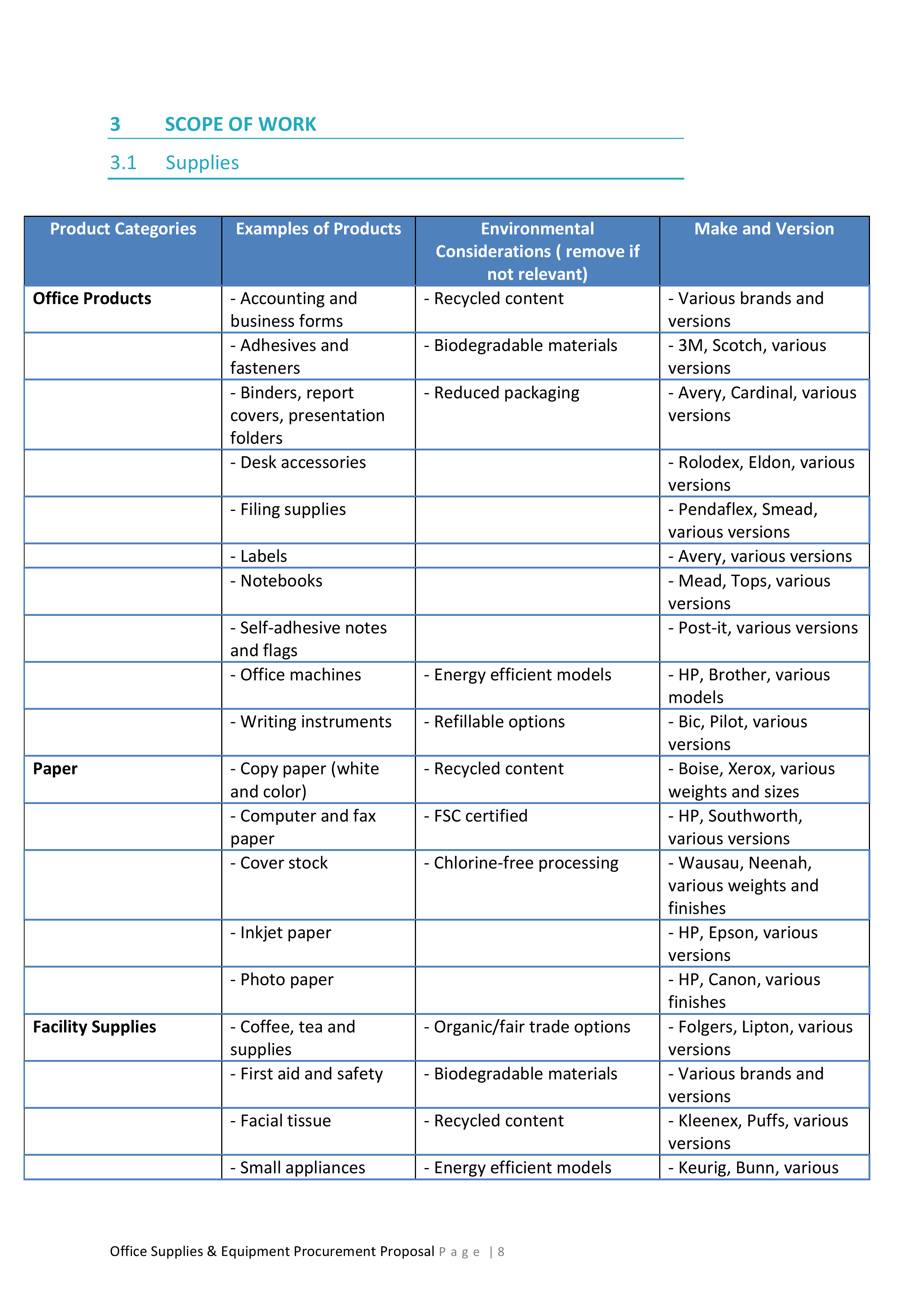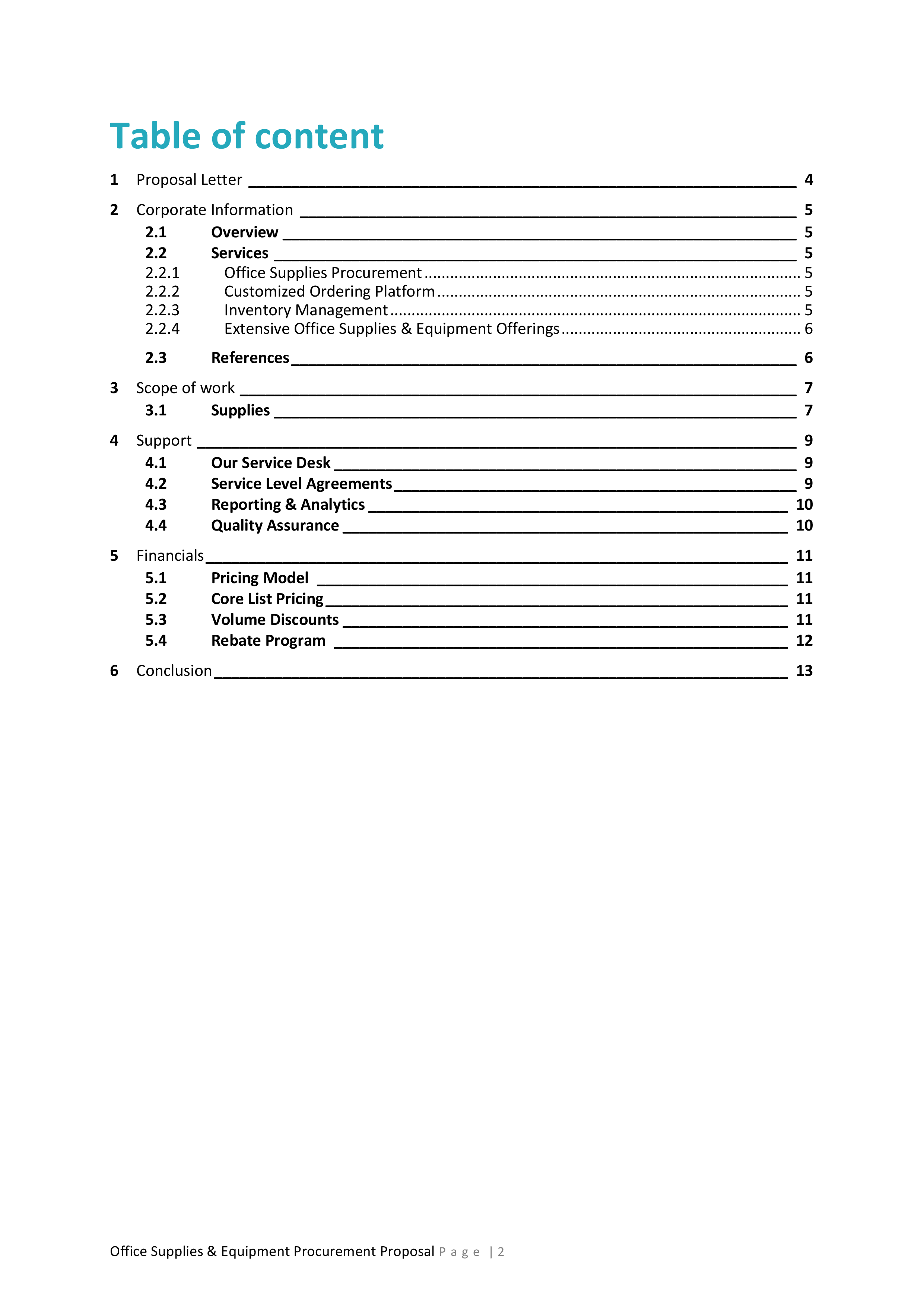 Our template includes all the essential sections you need to create a compelling proposal. From an executive summary that highlights the key points of your proposal to a detailed scope of work that outlines the specific supplies and equipment you will procure, our template covers it all.