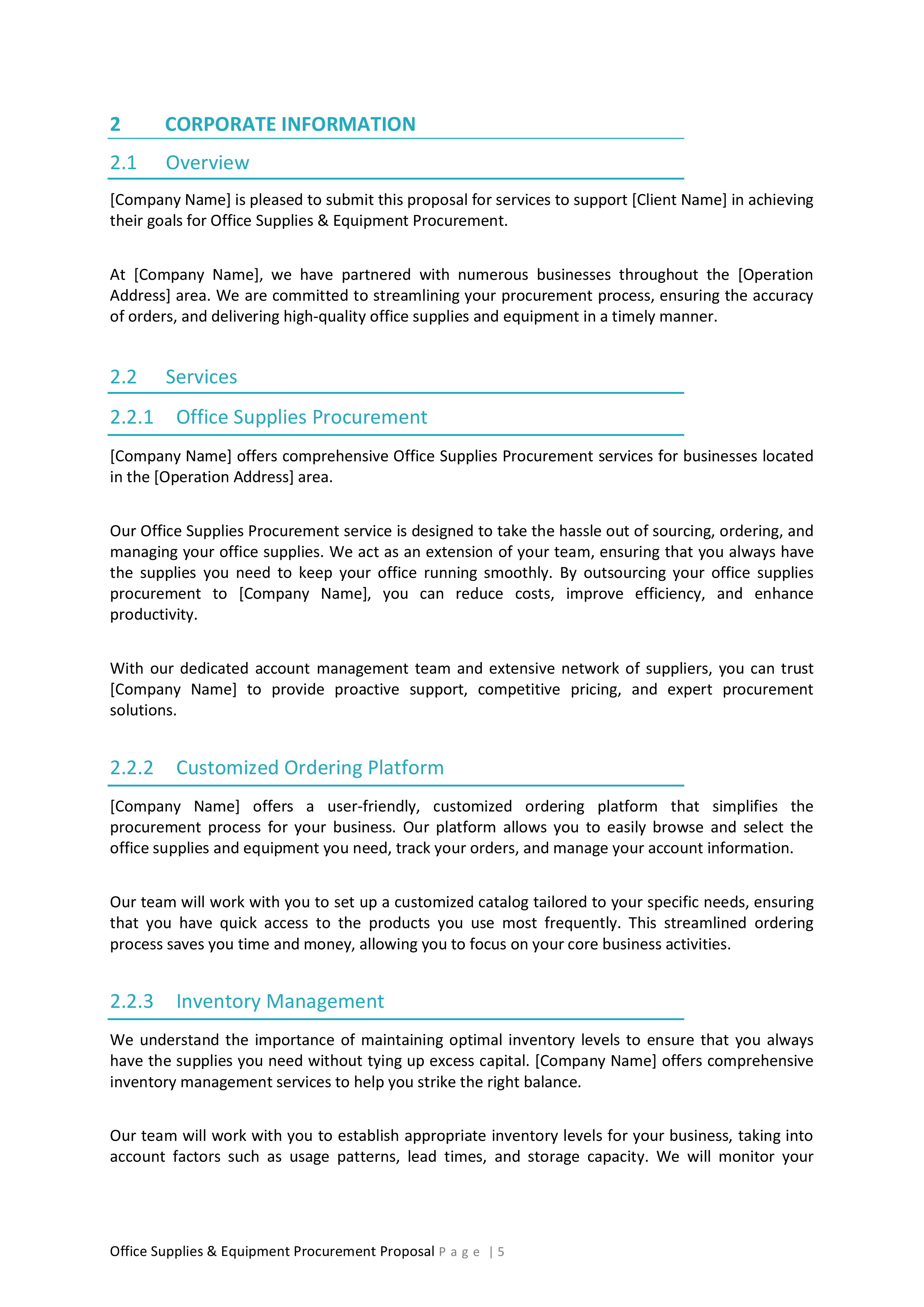 Designed specifically for procurement professionals, this template is the ultimate tool to streamline your office supplies and equipment procurement process. With its sleek and modern design, it will impress your clients and give your proposals a professional edge.