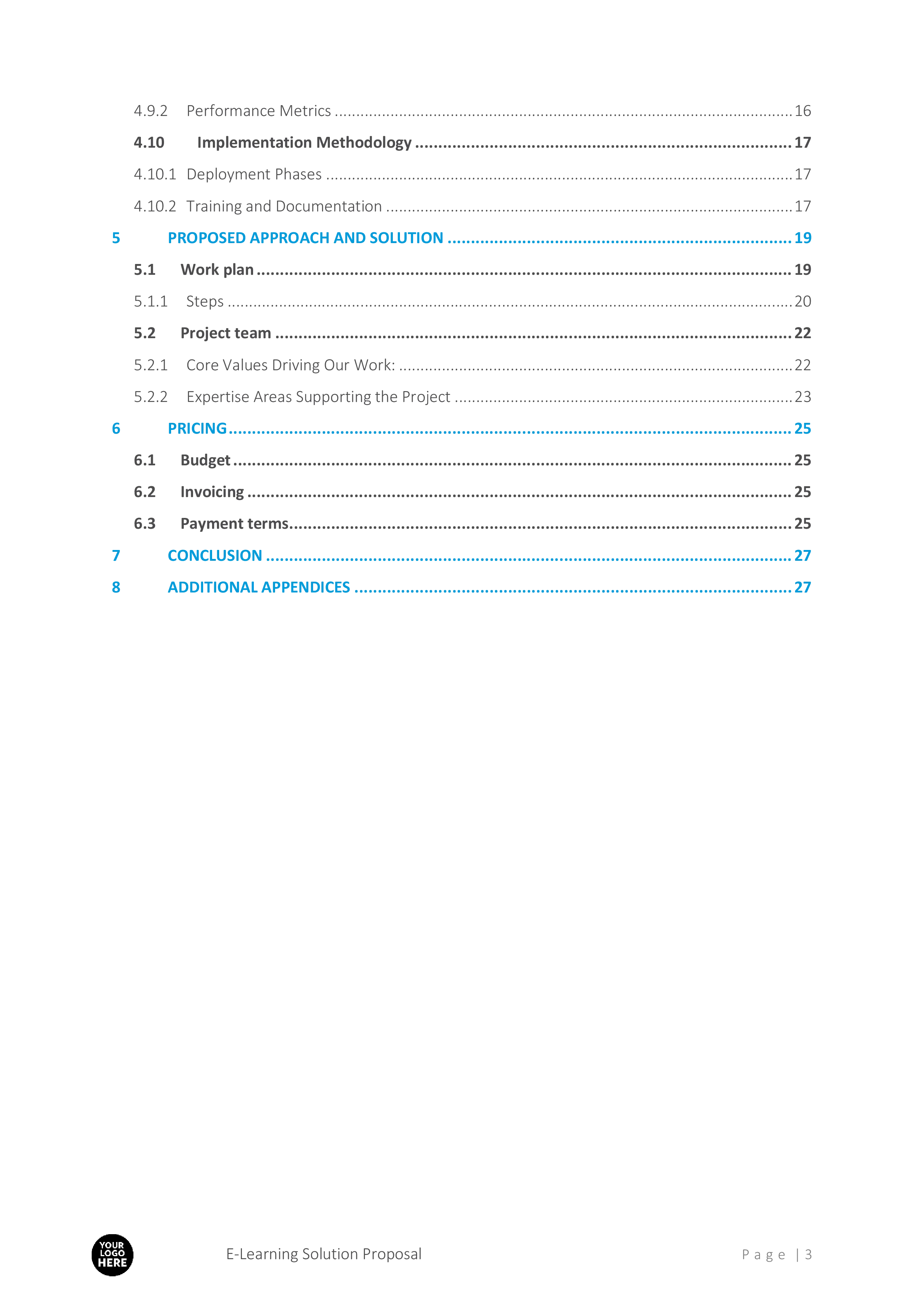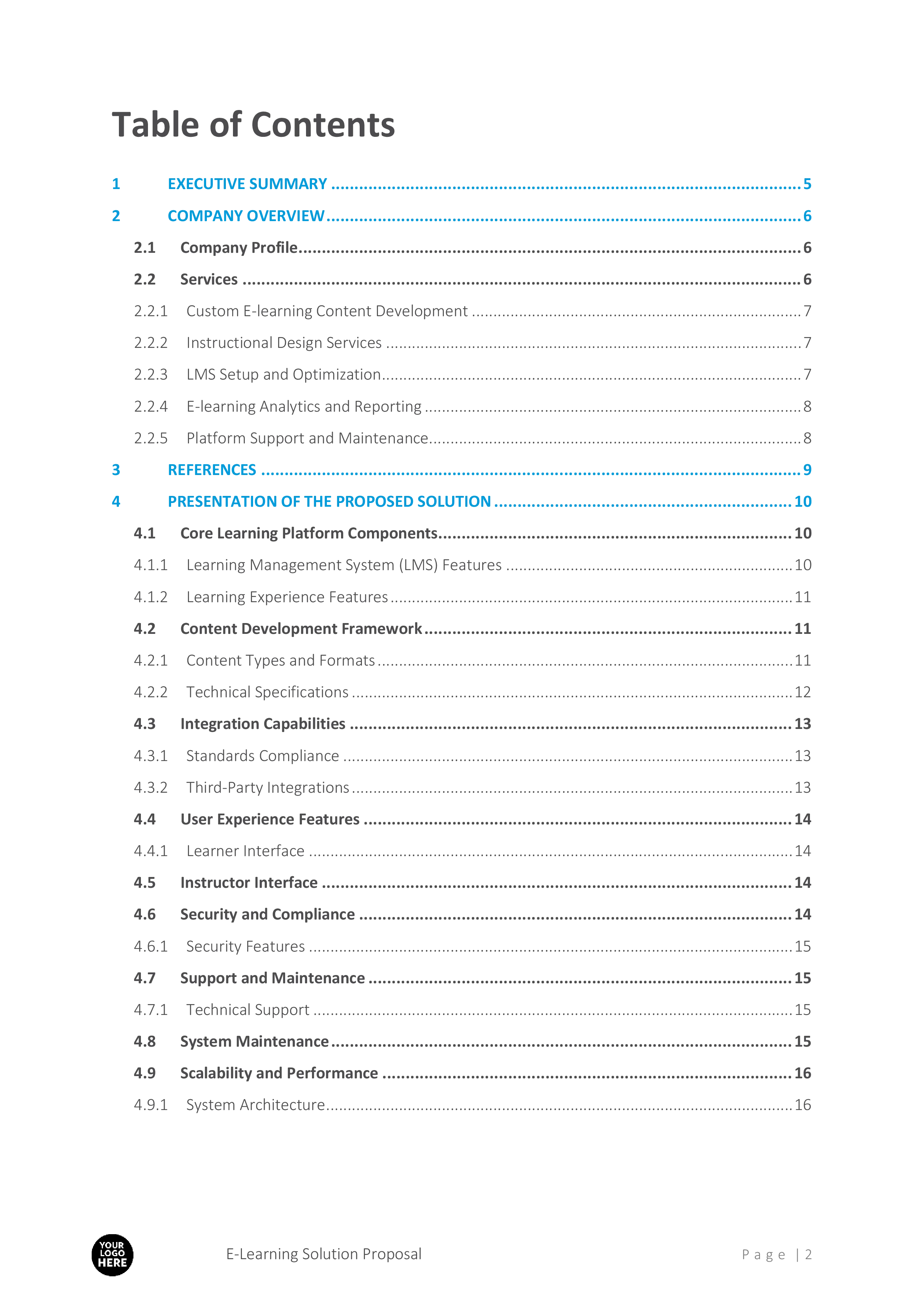With a detailed table of contents, this template ensures every essential aspect of an e-learning proposal is covered, from executive summaries to pricing details. Key sections include: