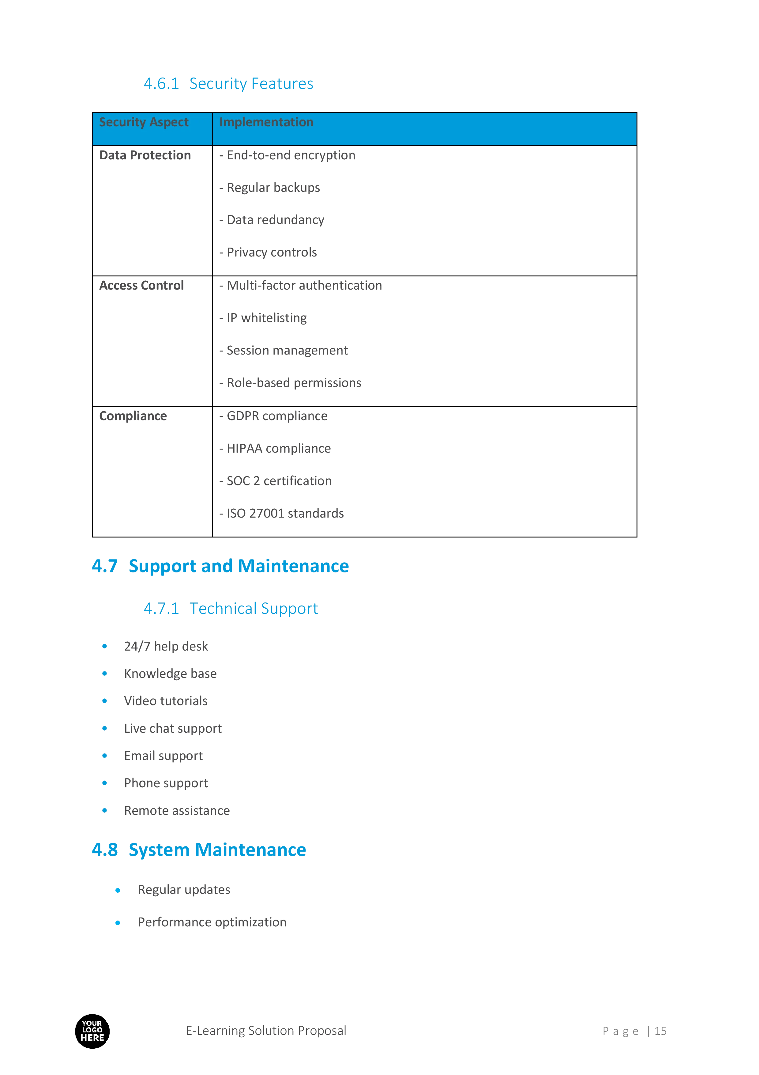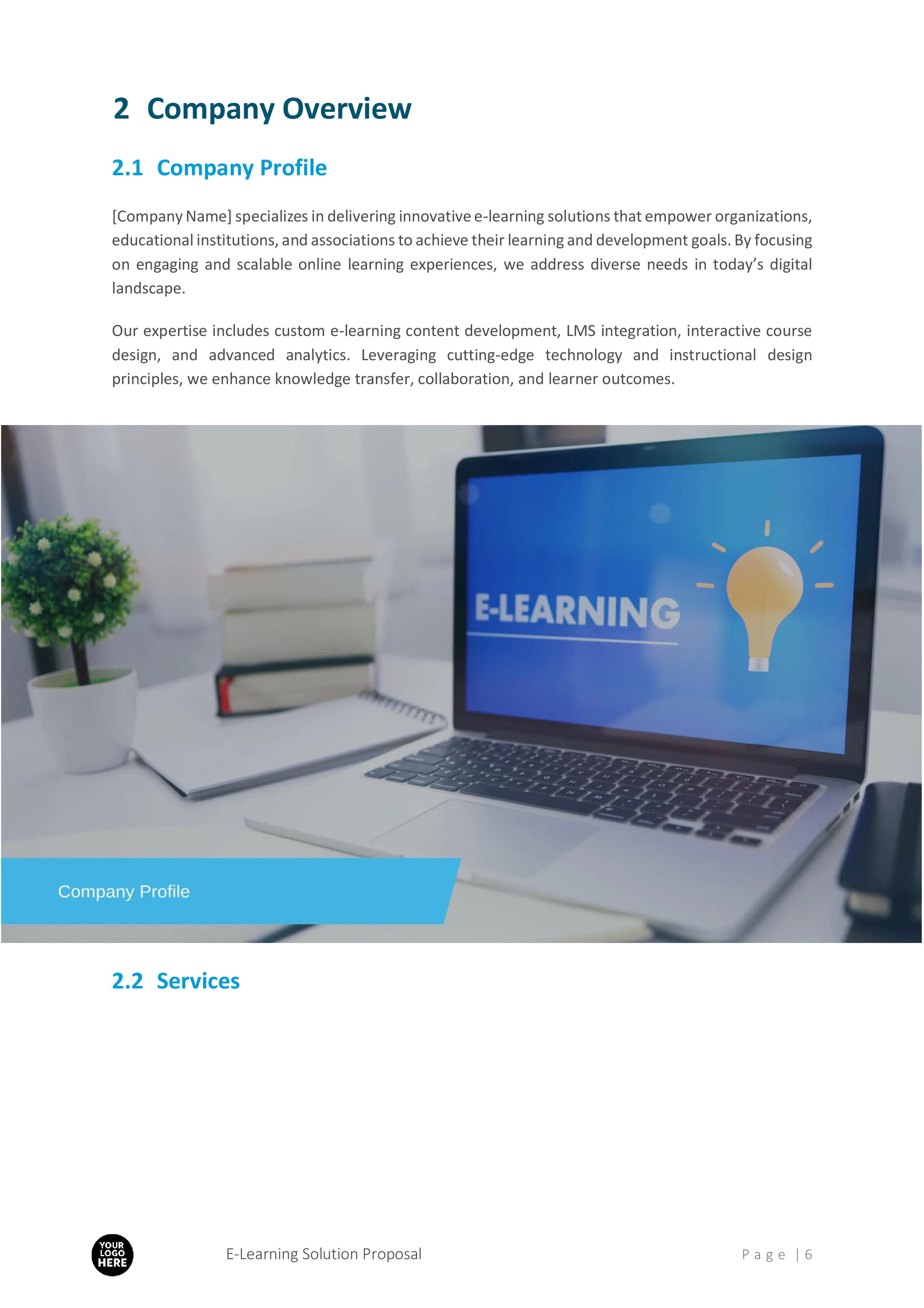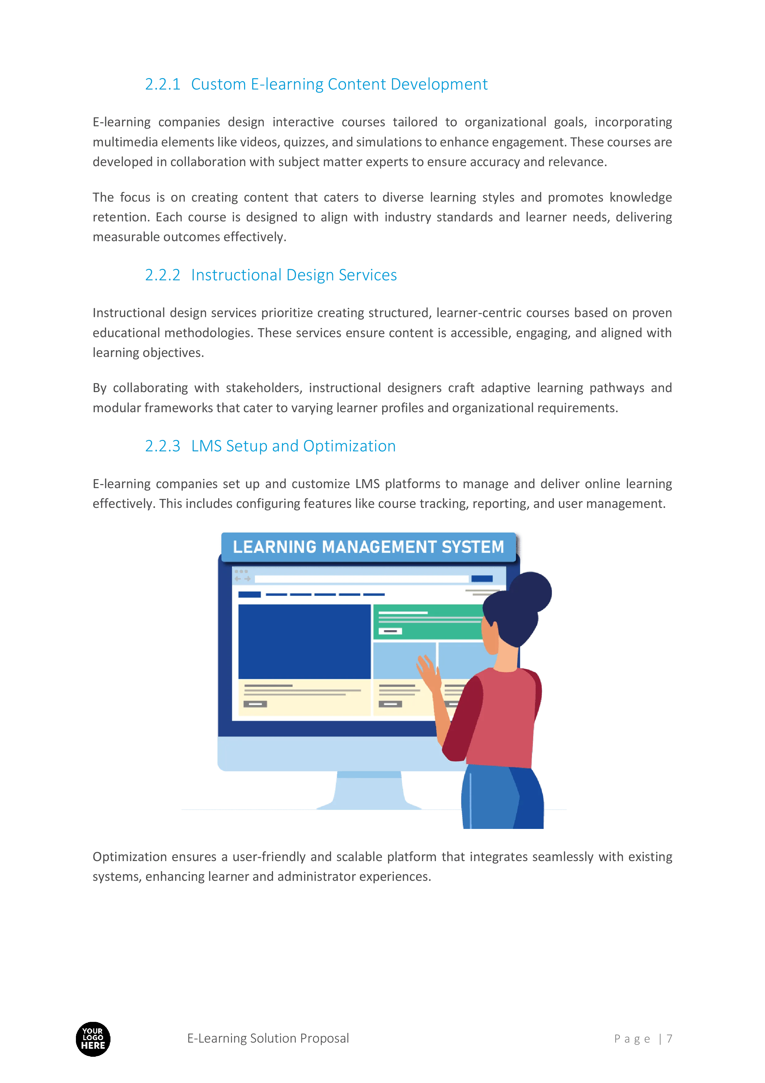 - Custom E-learning Content Development: Detailed plans for interactive and multimedia content.
