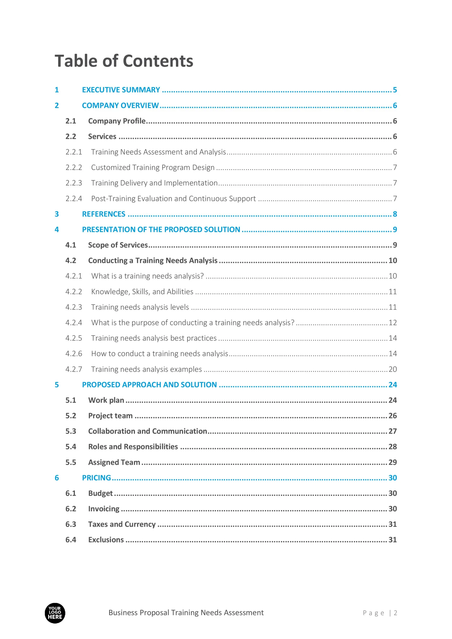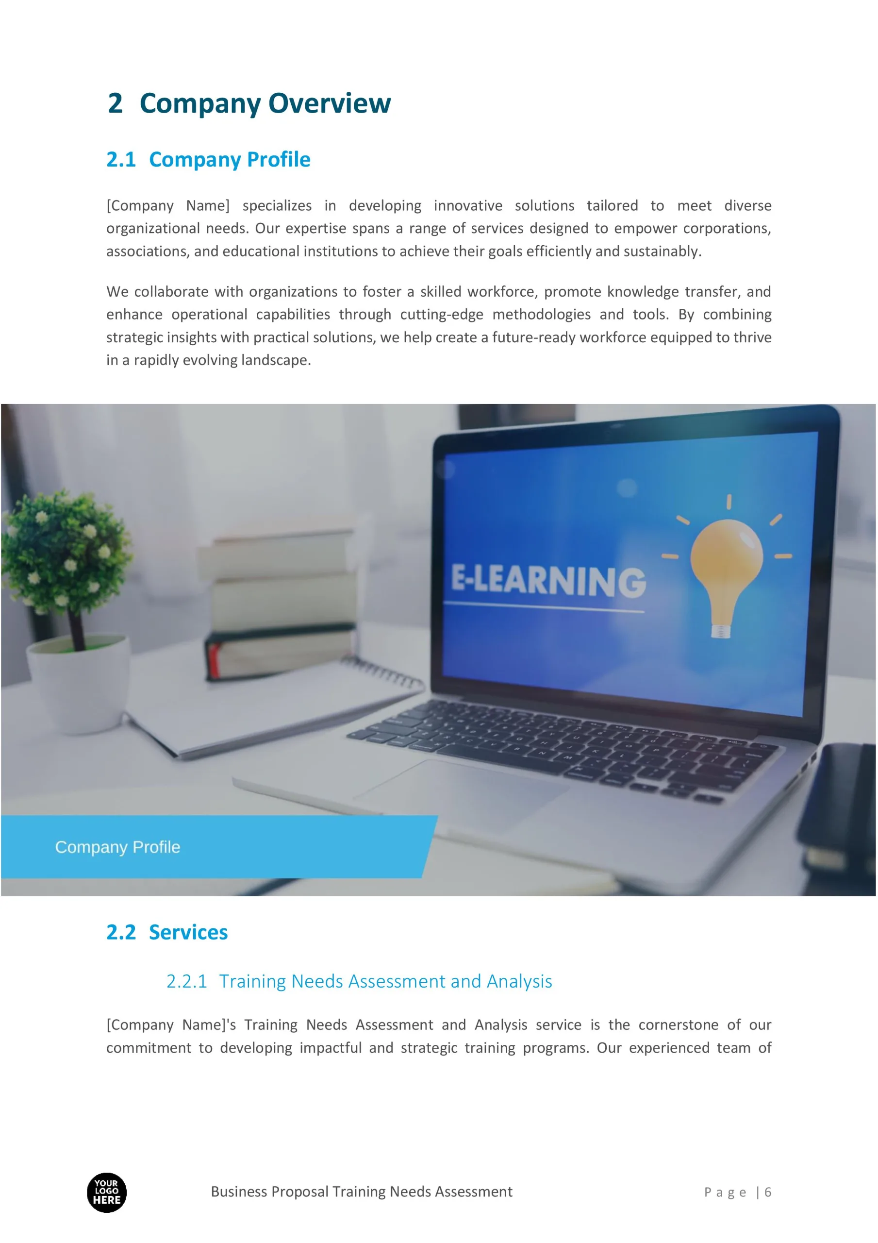 - Company Overview: Sections for outlining the organization’s profile, services, and expertise in training and development.
