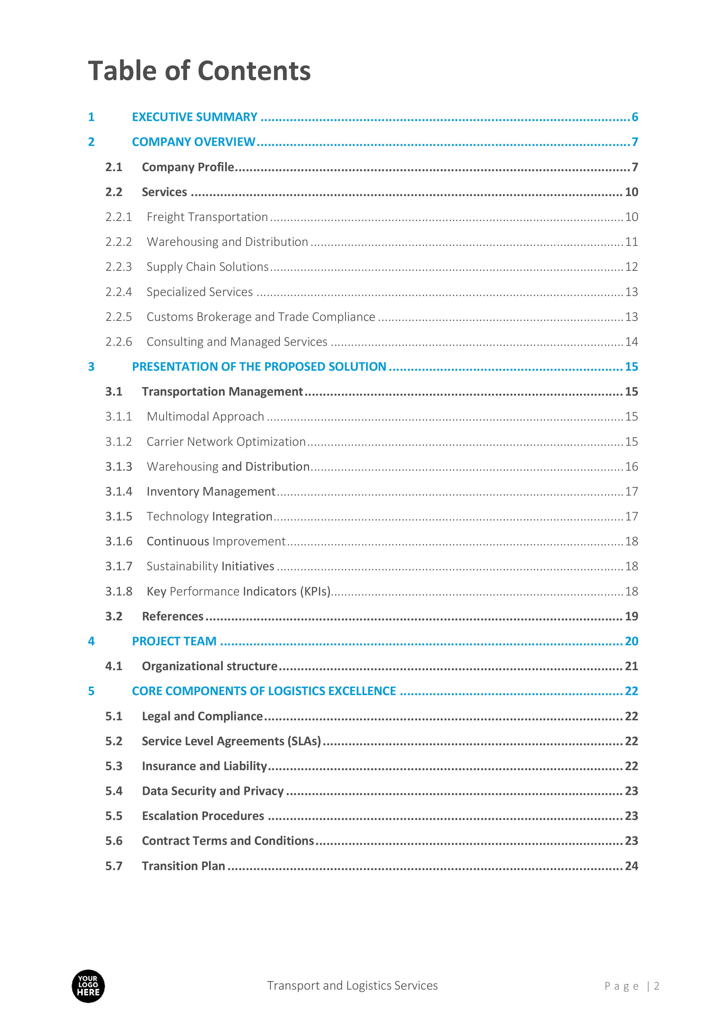 Save valuable time and effort by utilizing our professionally written content, which covers all essential aspects of a transport and logistics proposal. From an executive summary that captures attention to a detailed scope of services, our template ensures that you present a comprehensive and persuasive proposal that leaves a lasting impression.