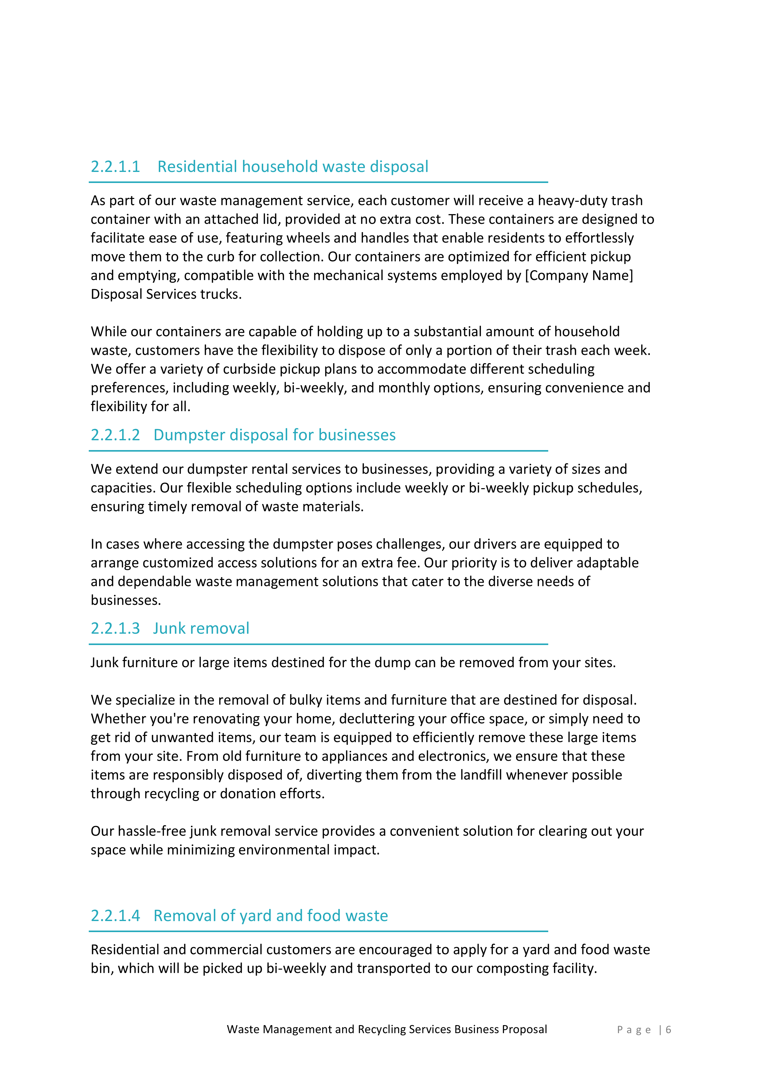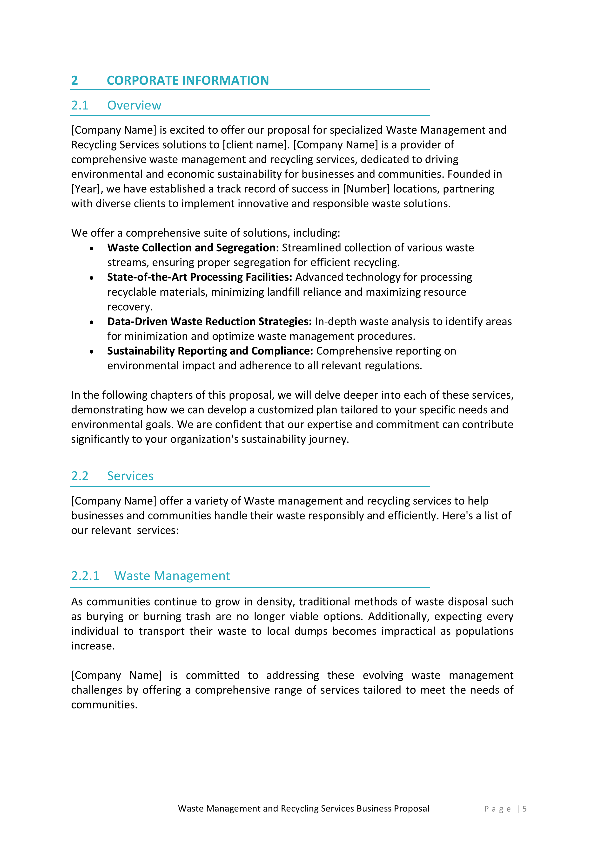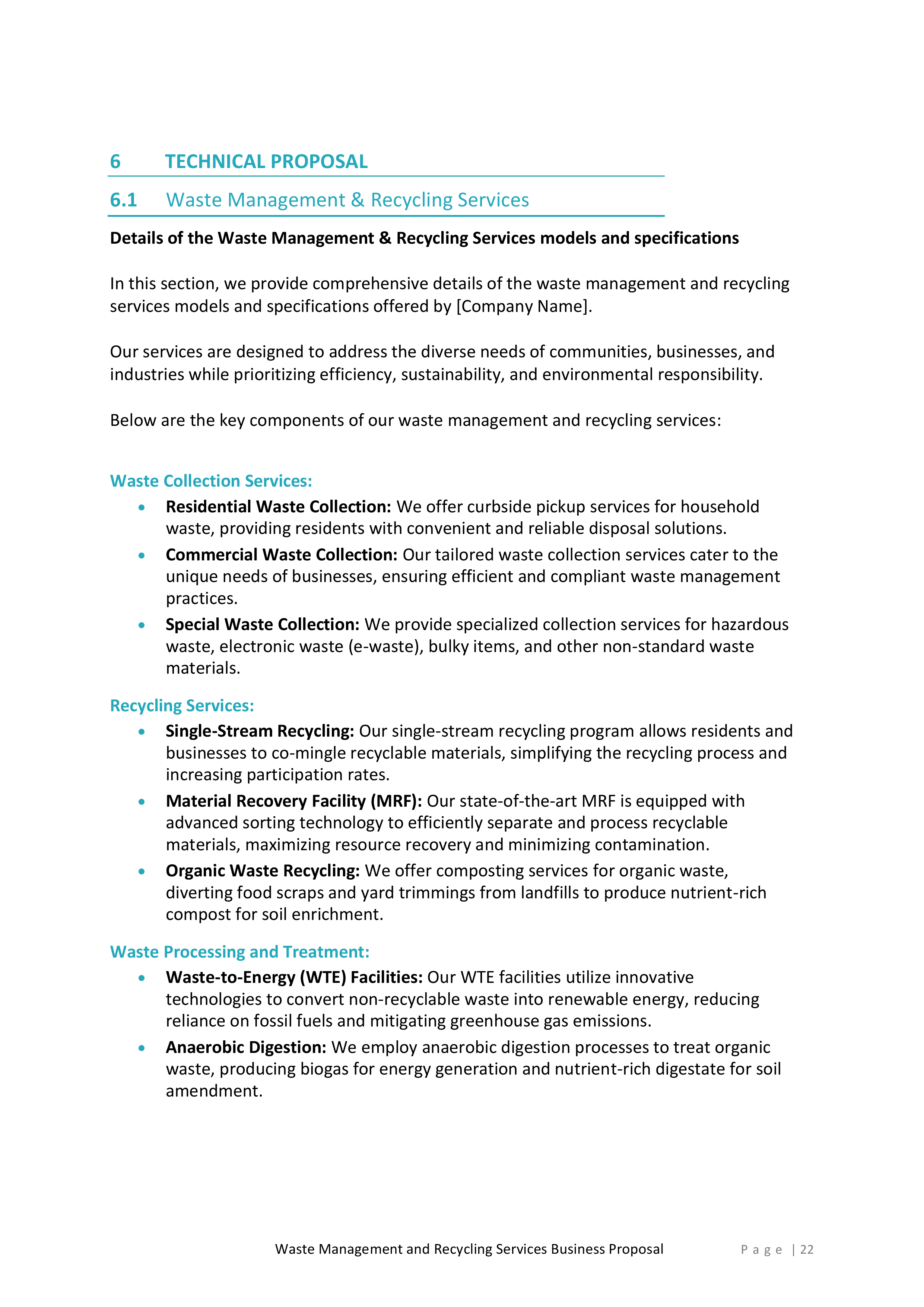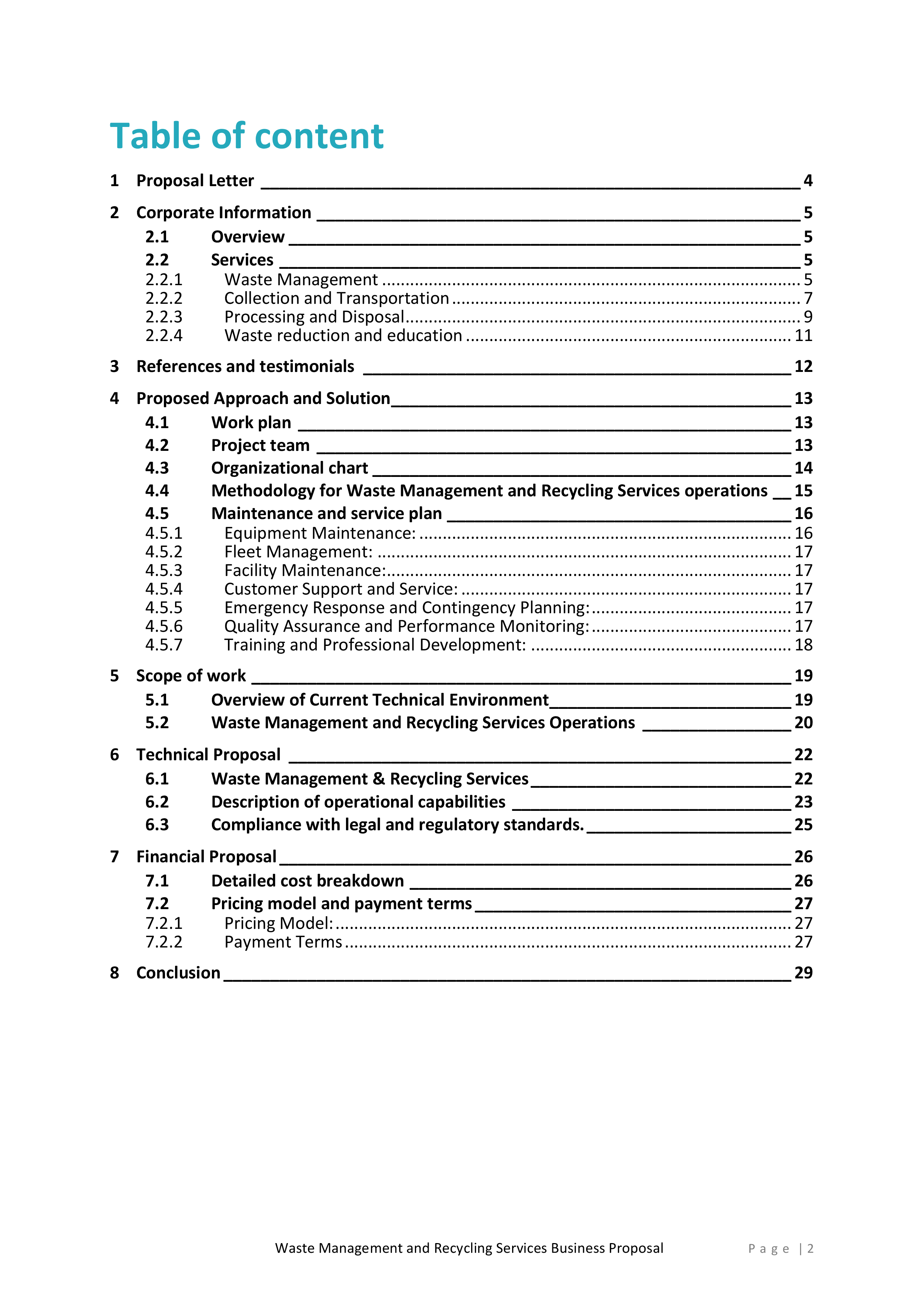 Inside, you’ll find a detailed introduction that highlights your company’s mission, values, and experience in the waste management and recycling industry. This section will help you establish credibility and build trust with potential clients.