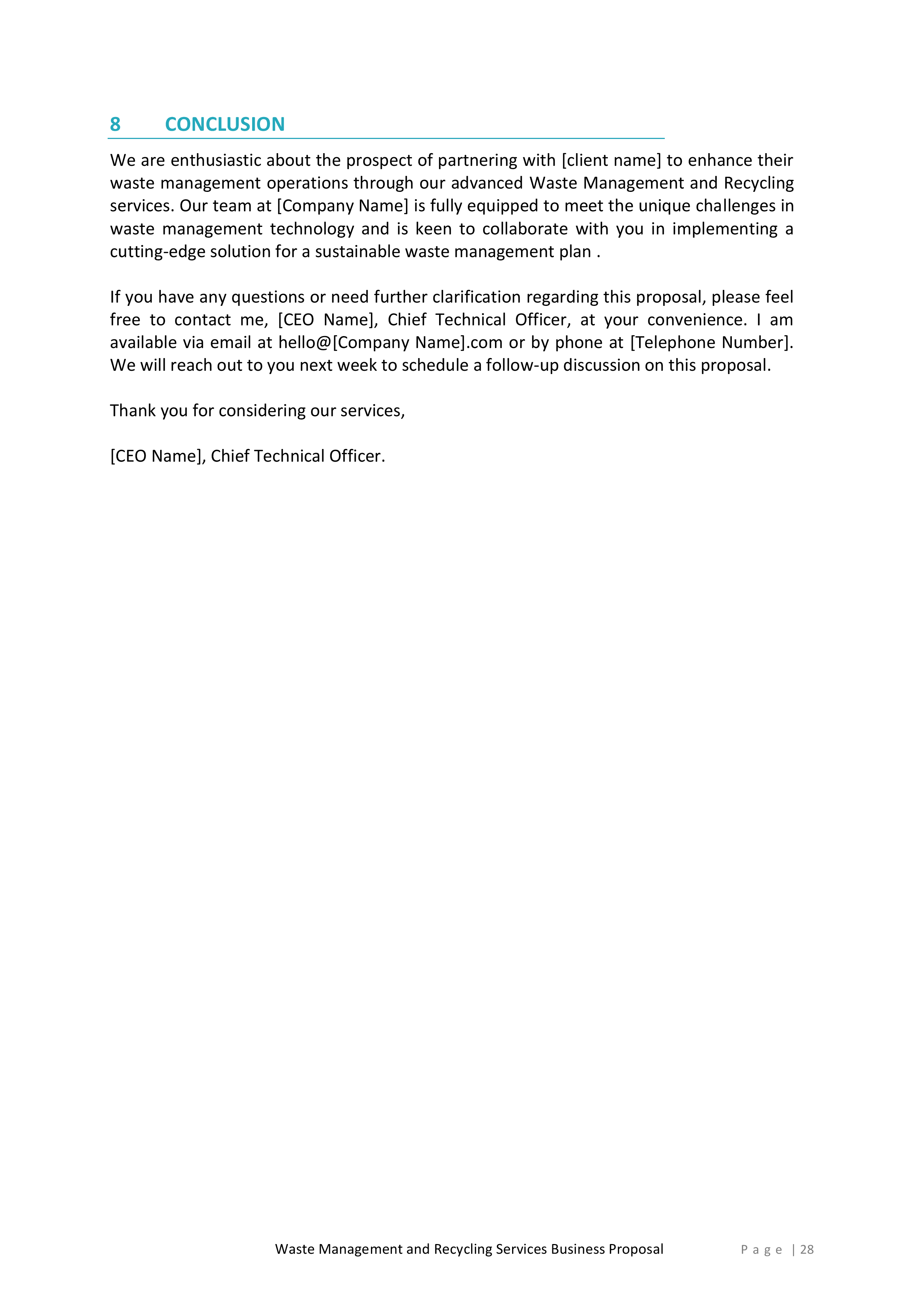 Finally, our proposal template offers a customizable conclusion section, allowing you to summarize the key benefits of choosing your waste management and recycling services. You can also include a call-to-action, encouraging potential clients to take the next steps towards a greener future.
